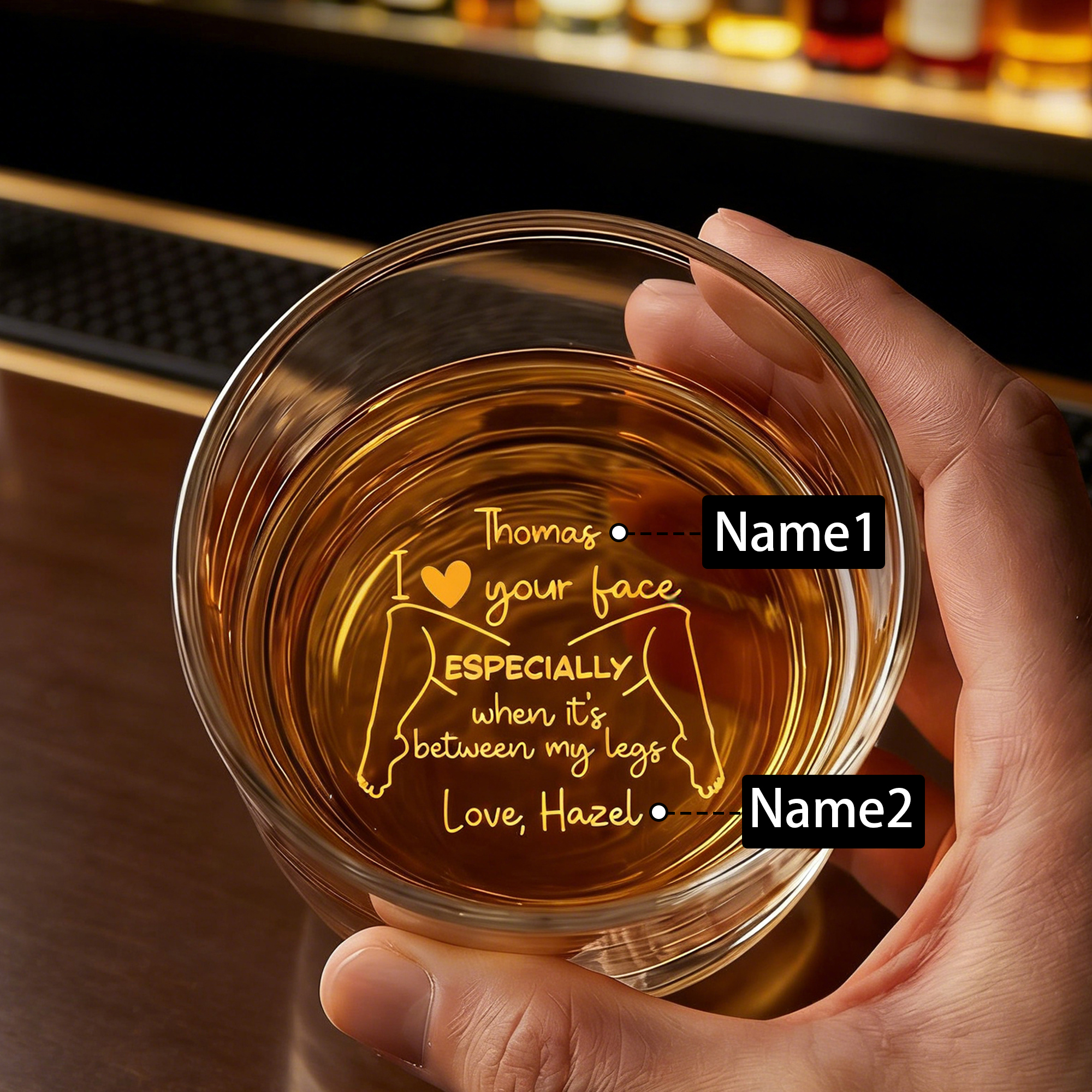 Bold & Personalized Design – This whiskey glass features a playful and intimate engraved message with a silhouette of a woman’s legs framing the text. The design is both cheeky and romantic, making it a perfect expression of love with a dash of humor.