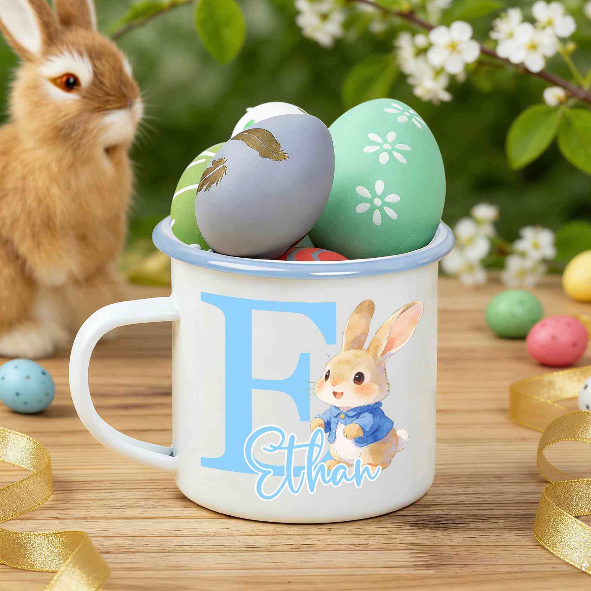 Bunny Alphabet Artwork - This enamel mug showcases an adorable cartoon bunny with a letter initial, creating a bright and happy Easter style. Gentle hues and charming details bring a fresh spring feeling that children are drawn to right away.