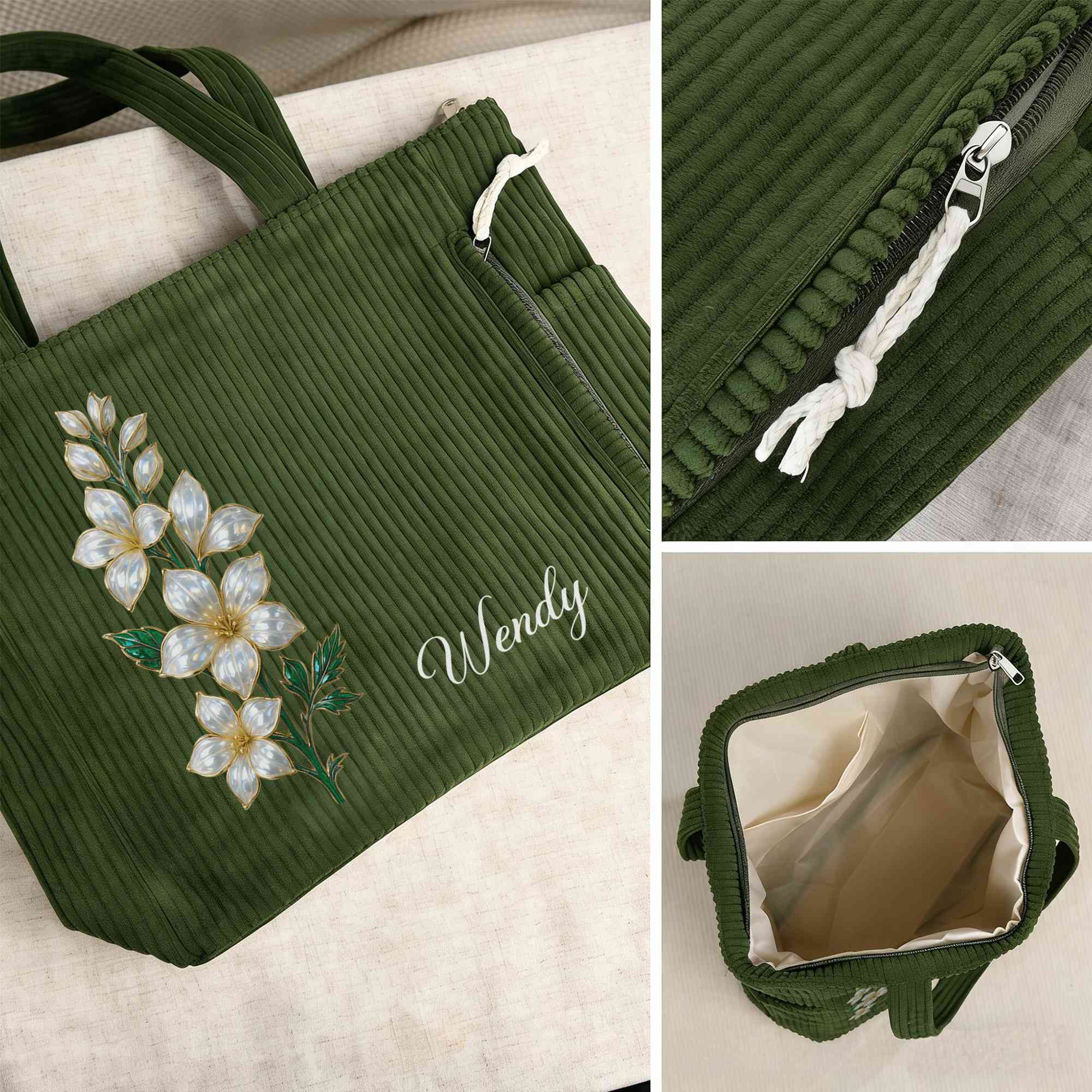 Elegant Floral Design - This corduroy tote bag showcases a refined birth flower with luminous mother-of-pearl effect and gold trim. The artistic, graceful lines and well-proportioned layout create an elegant, expressive style that works for daily errands and office routines alike.