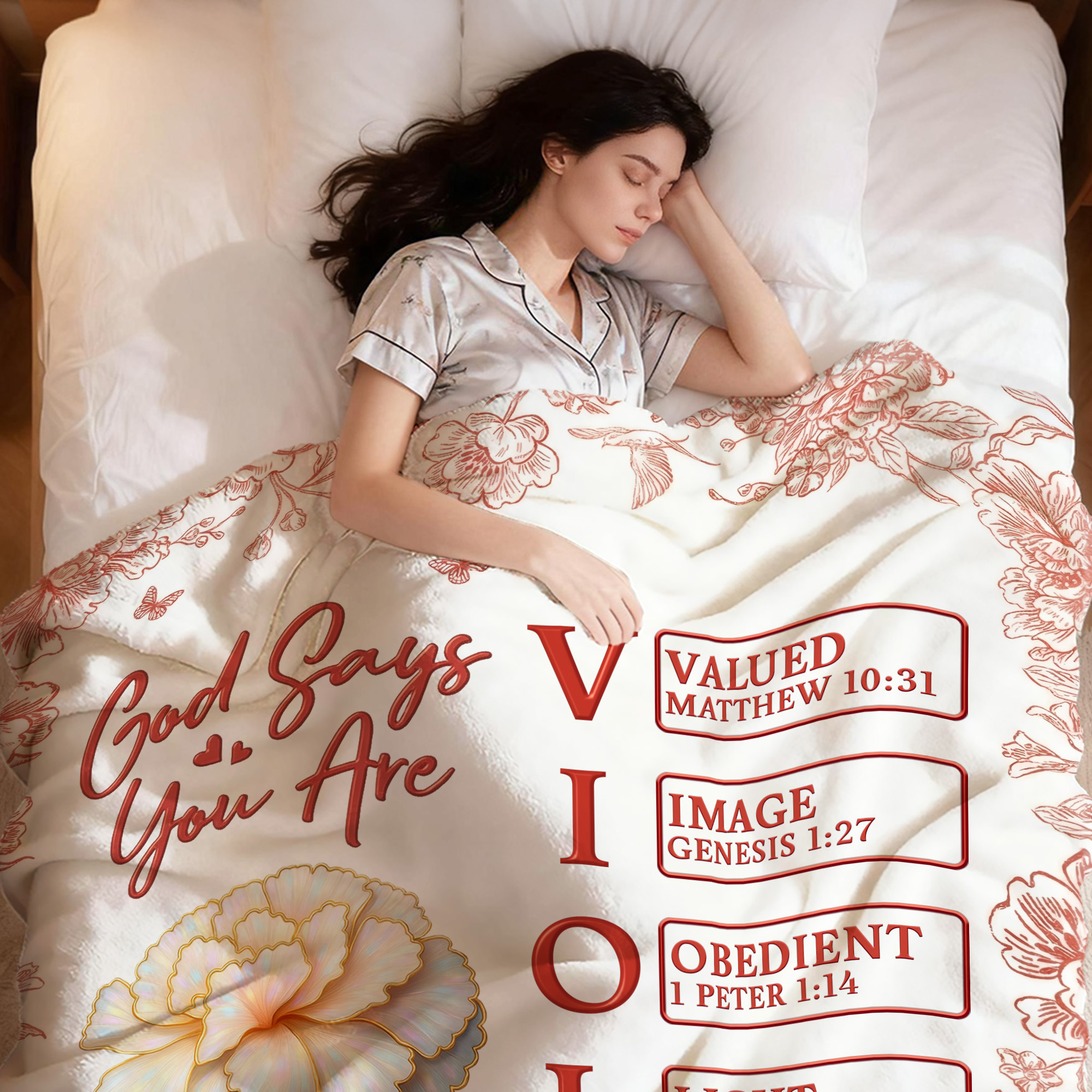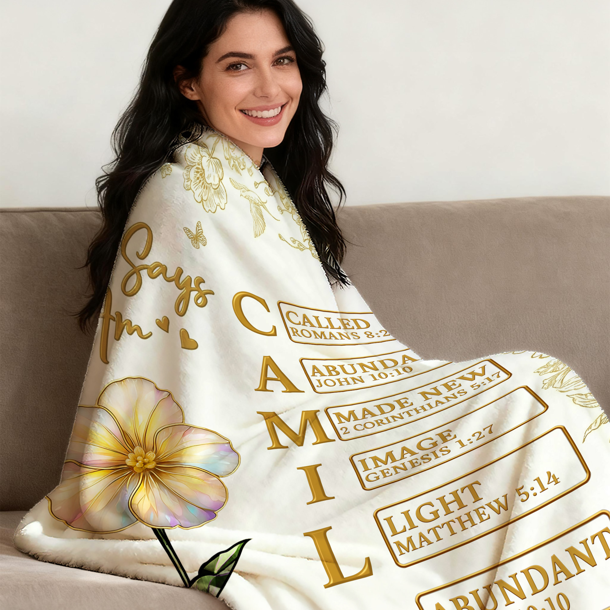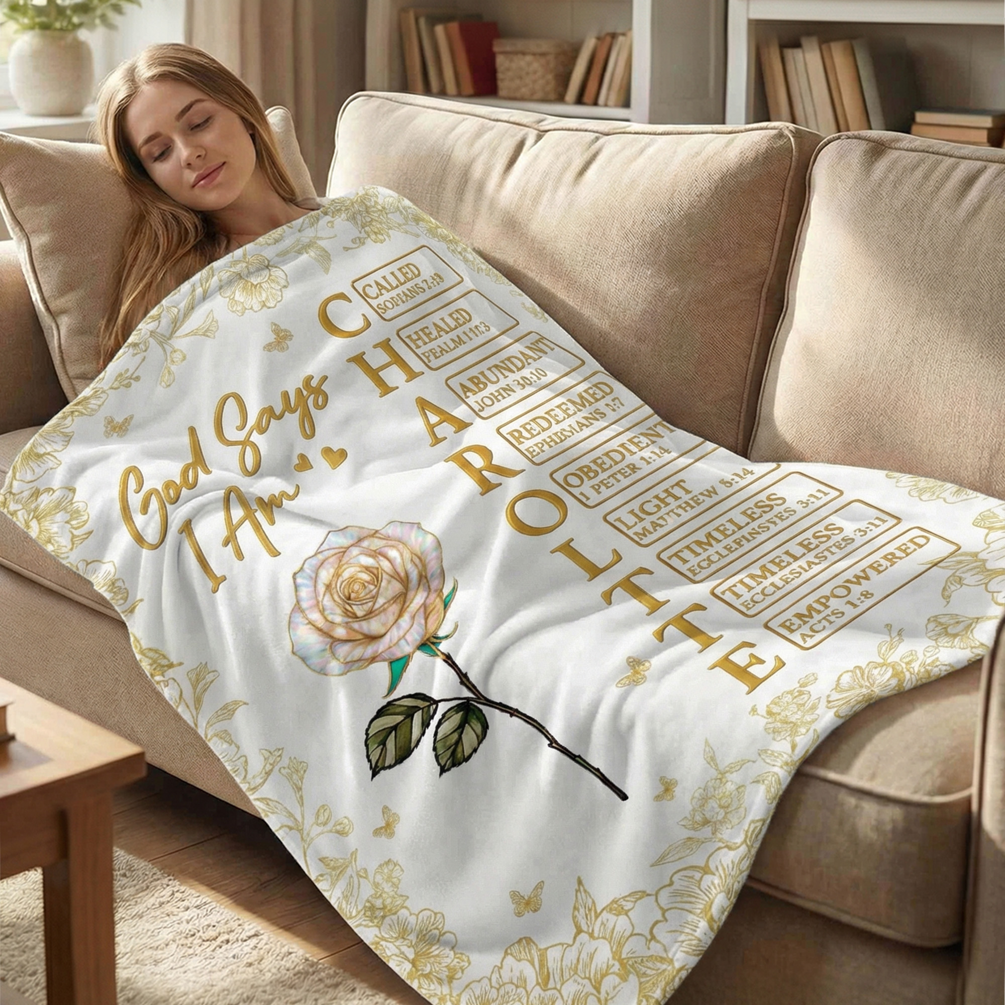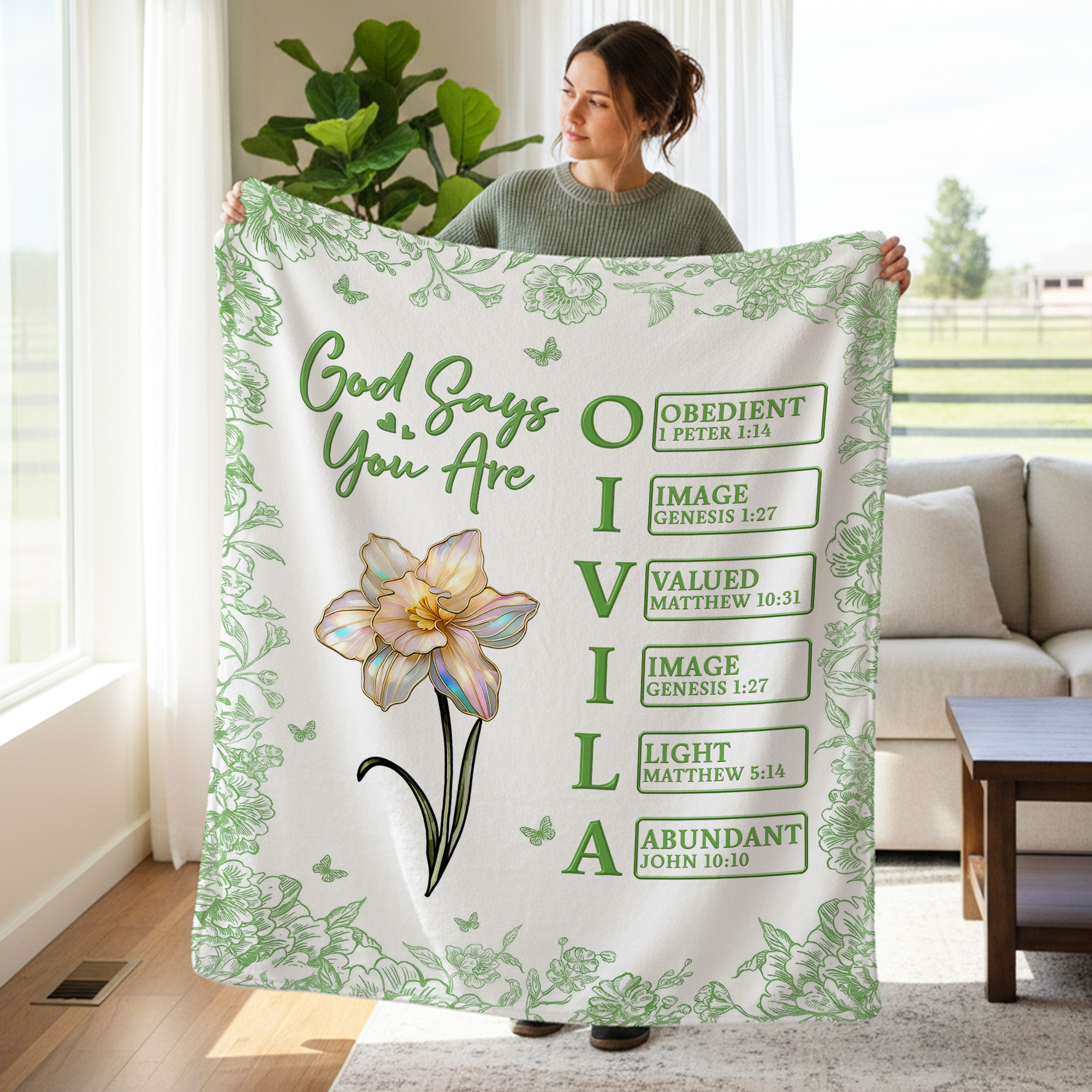 Faith-Filled Birth Flower Design - This blanket features a mother of pearl–inspired birth flower paired with uplifting “God Says I Am” Bible verses. The soft floral artwork, gentle heart accents, and multicolor details create a calm and graceful look that feels both personal and meaningful. It blends faith and beauty in a style that suits any bedroom or living space.