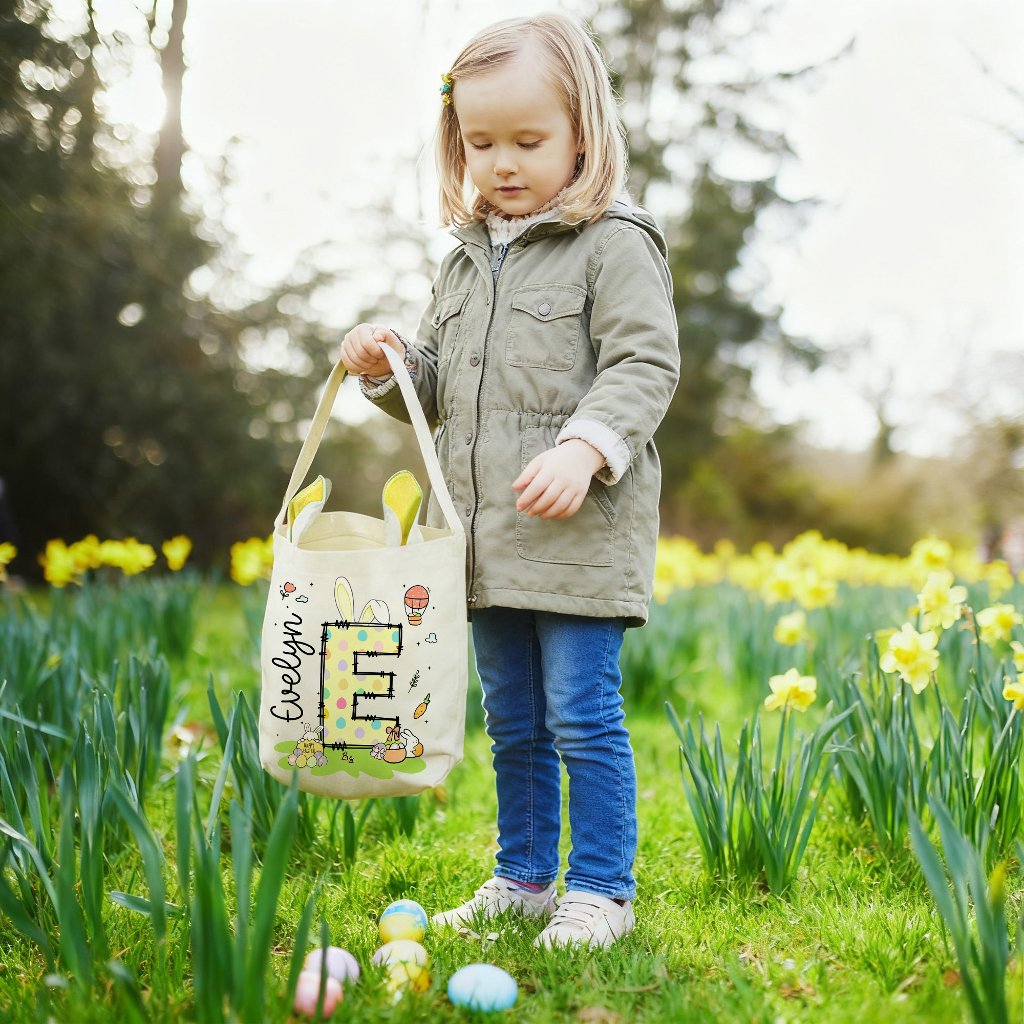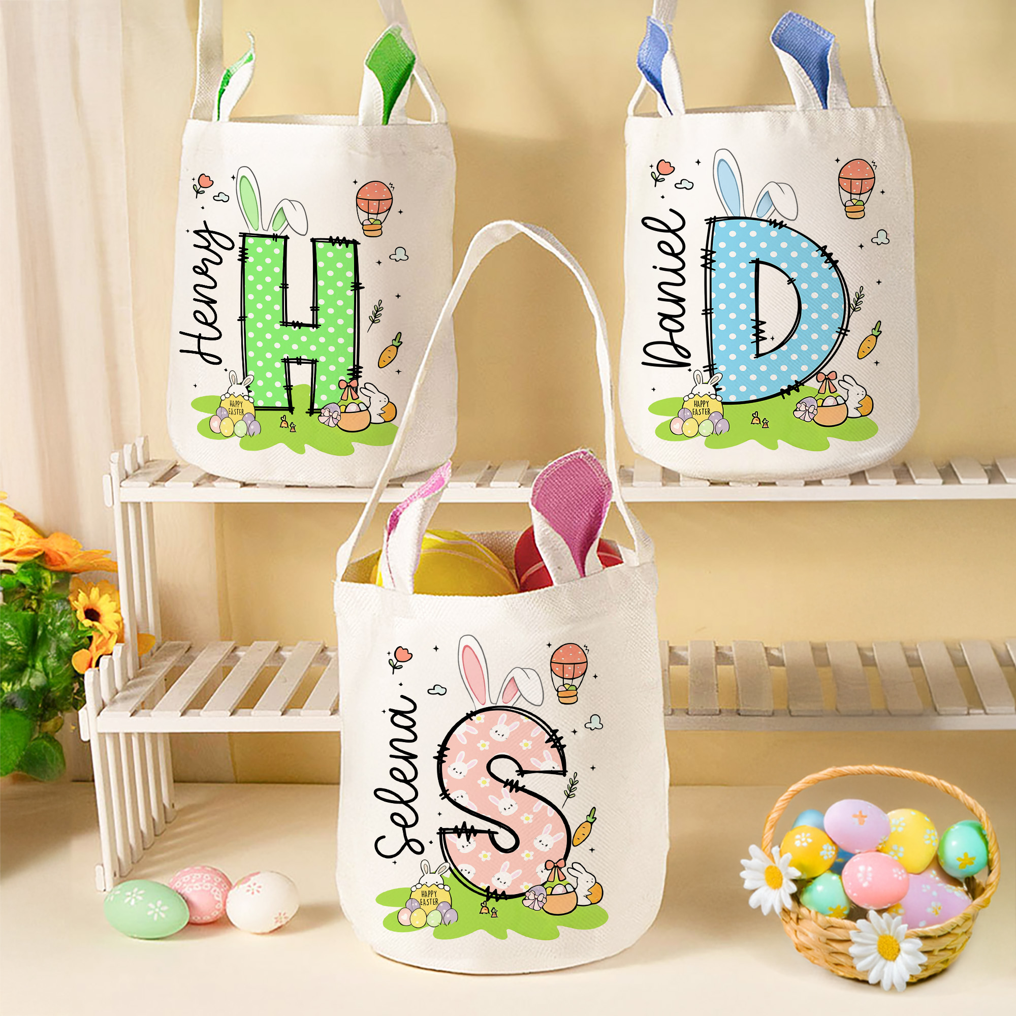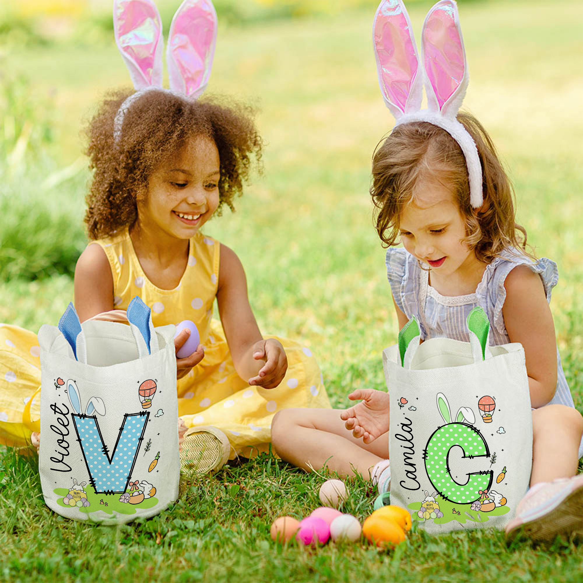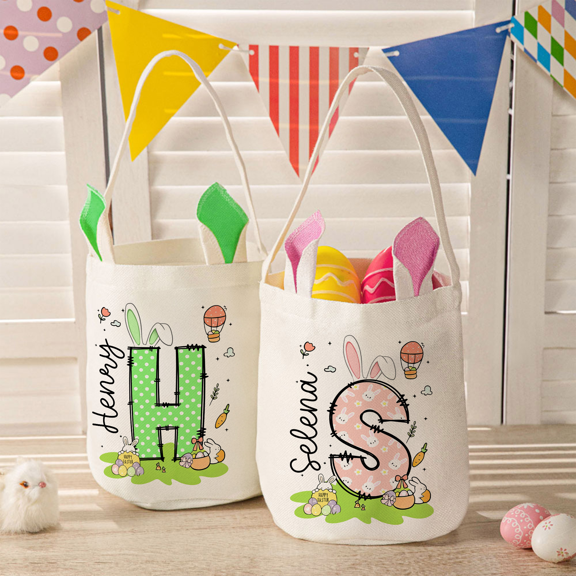 Custom Name Polka Dot Alphabet Bunny Ears Bucket Bag, Happy Easter Egg Hunt Basket, Cotton Linen Easter Goodie Bag, Easter Gift for Kids/Boys/Girls