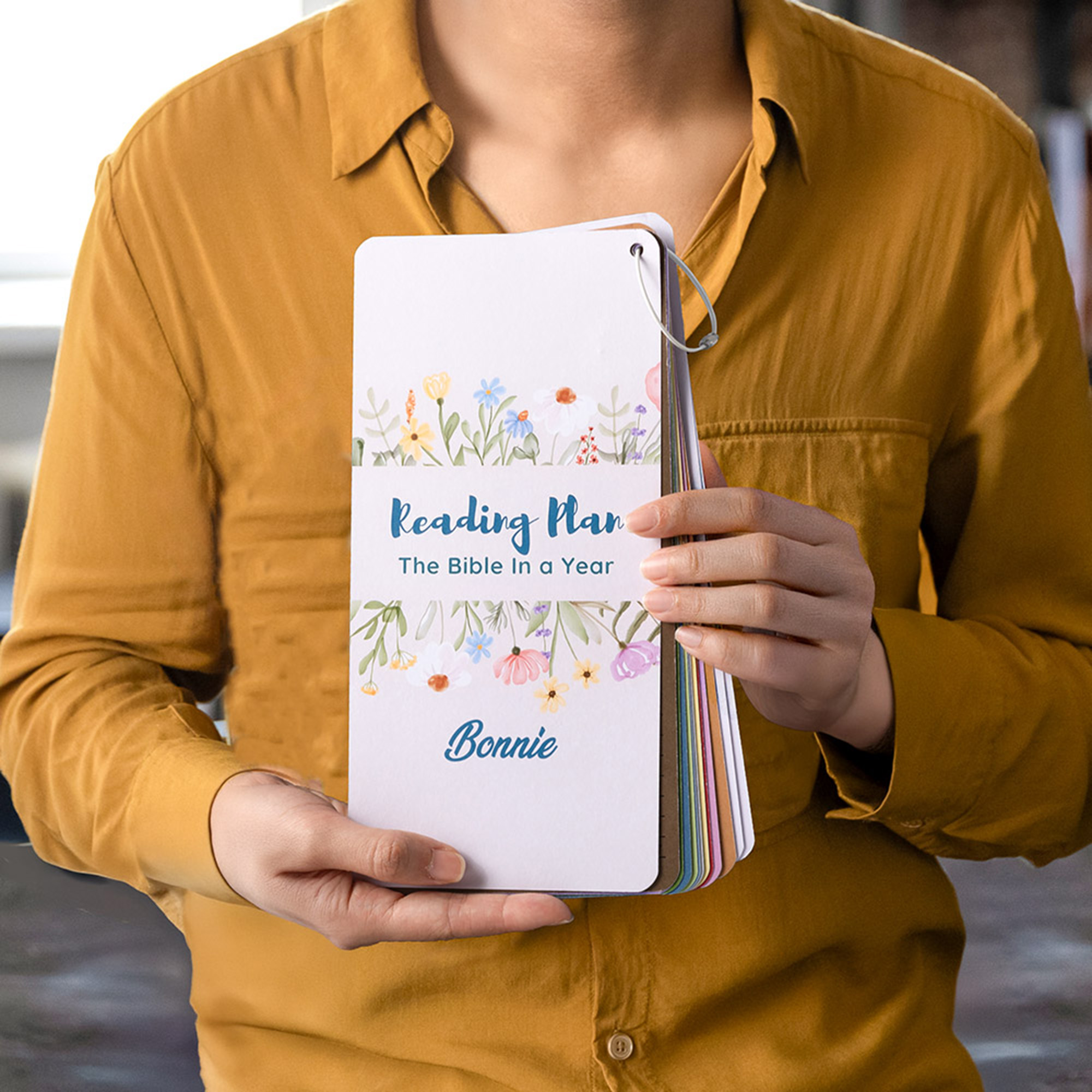 Practical Bookmark Design - This floral/cross Bible reading plan bookmark features a compact and colorful layout that’s easy to follow day by day. The pages are neatly secured with a hanging ring for quick flipping, and a matching pen is included for convenient daily use.