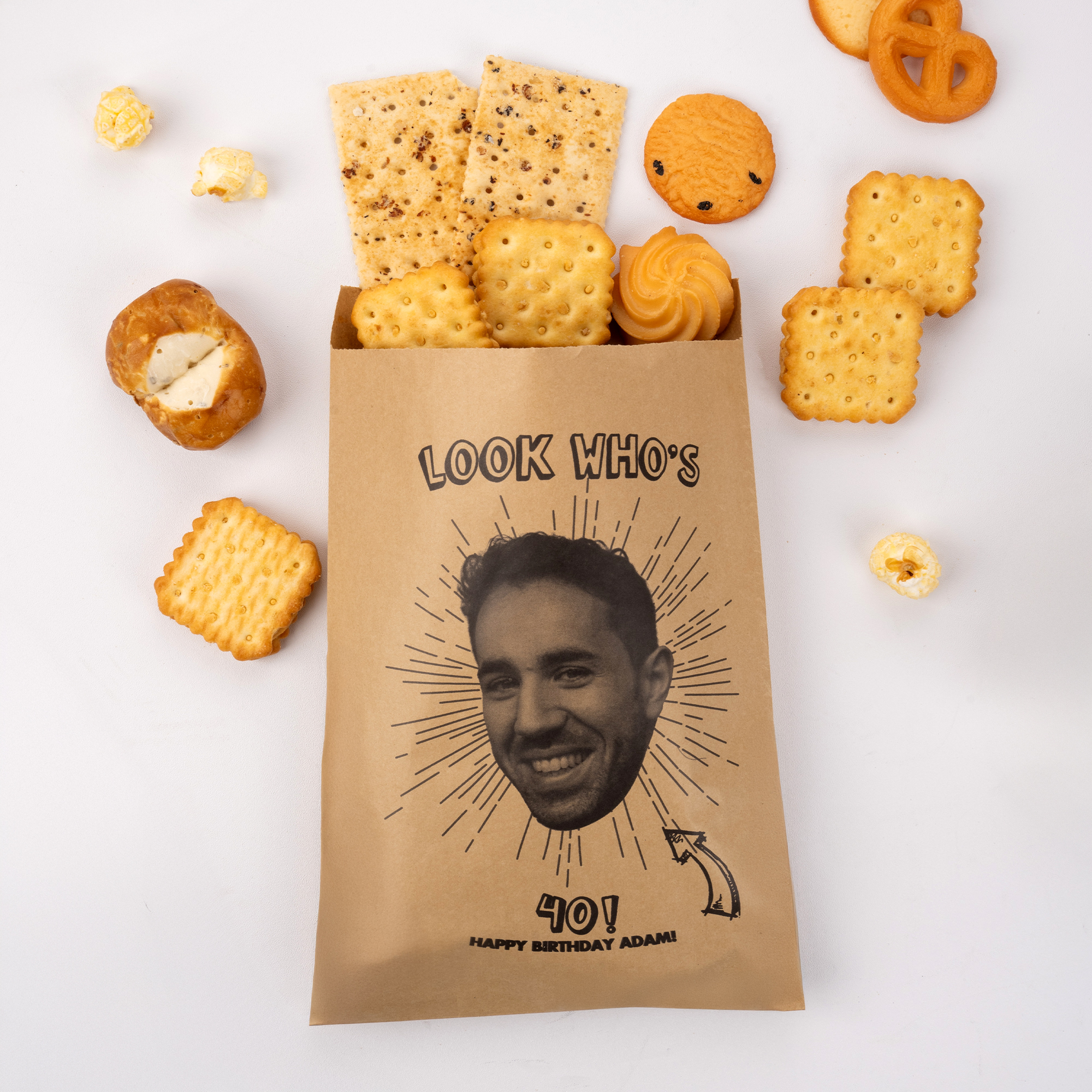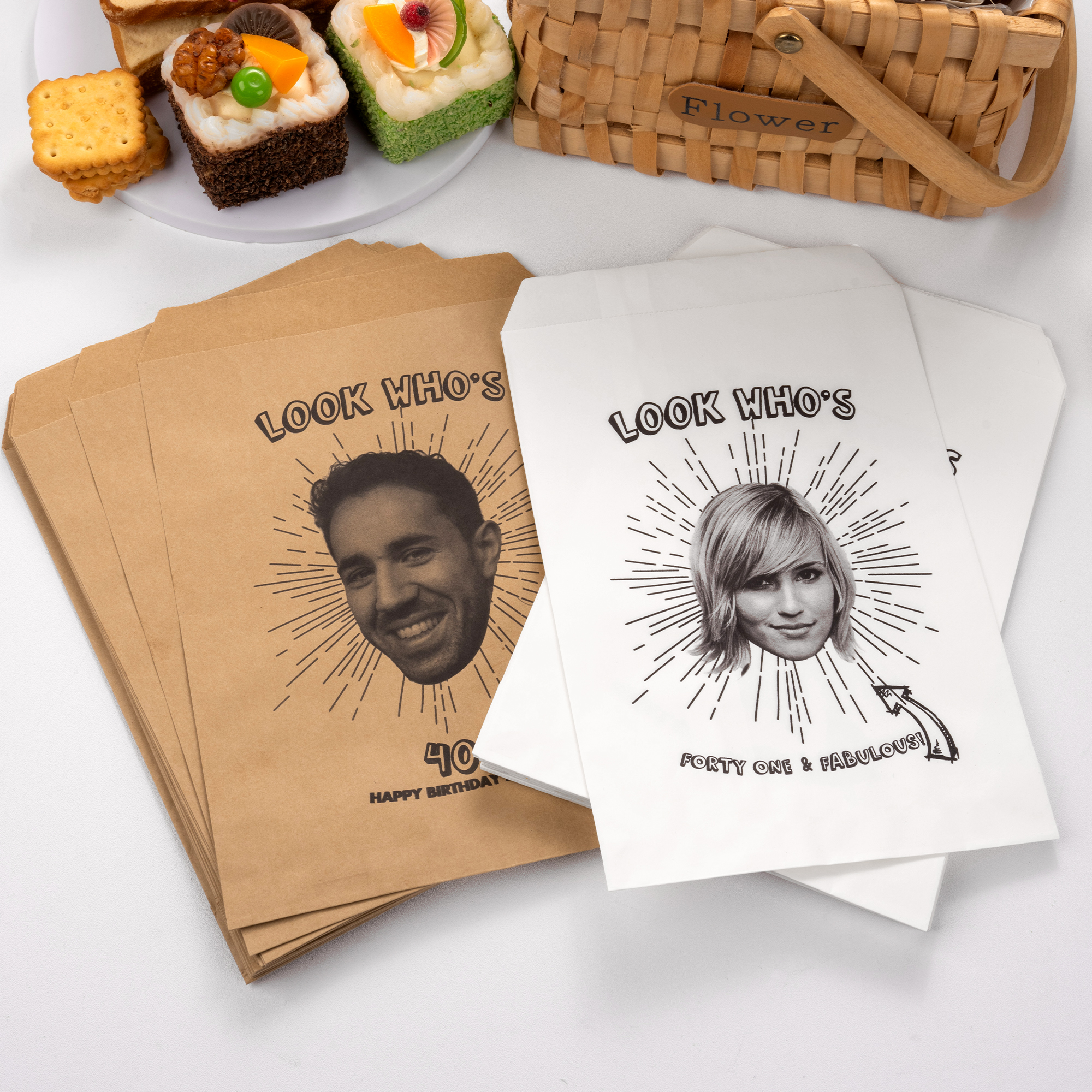 Custom Photo Personalization - These custom photo birthday favor bags offer a unique and personal touch to your celebrations. Showcase the guest of honor's face in a fun and memorable way with our milestone birthday face blow-up design. It's a whimsical and entertaining addition to your celebration, sure to bring smiles to everyone's faces.