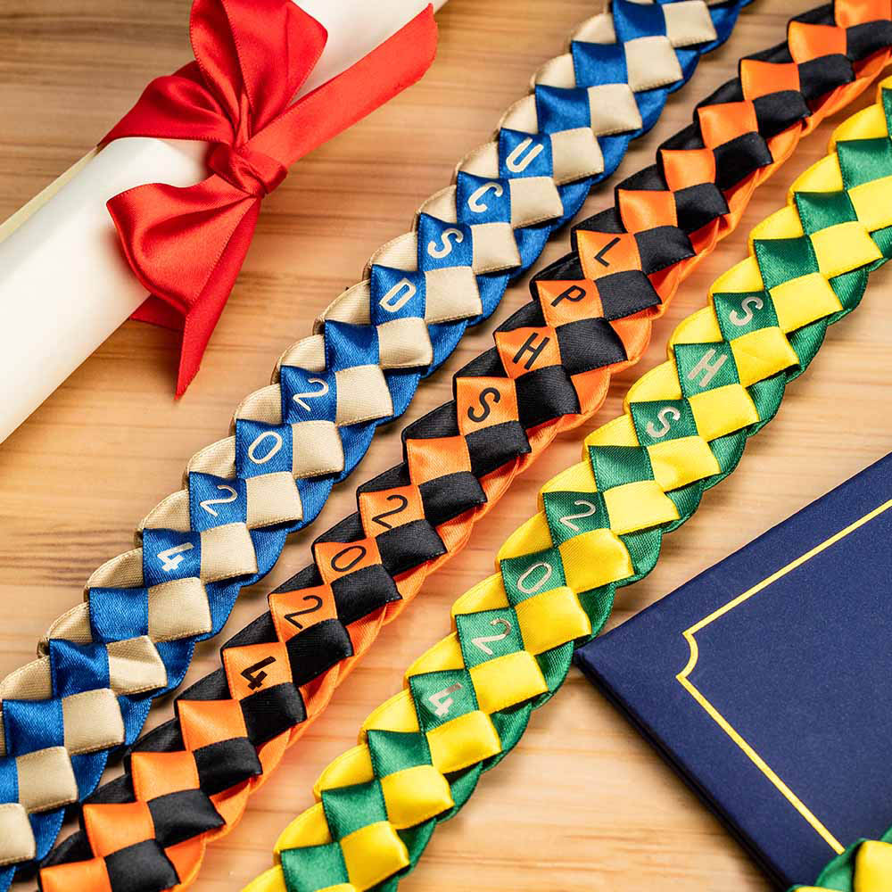 Feature of Ribbon Lei - A graduation ribbon lei can be customized with the color you choose. You can also personalize it with the graduation year, the abbreviations of your school, and your name to make it unique and only belongs to you.