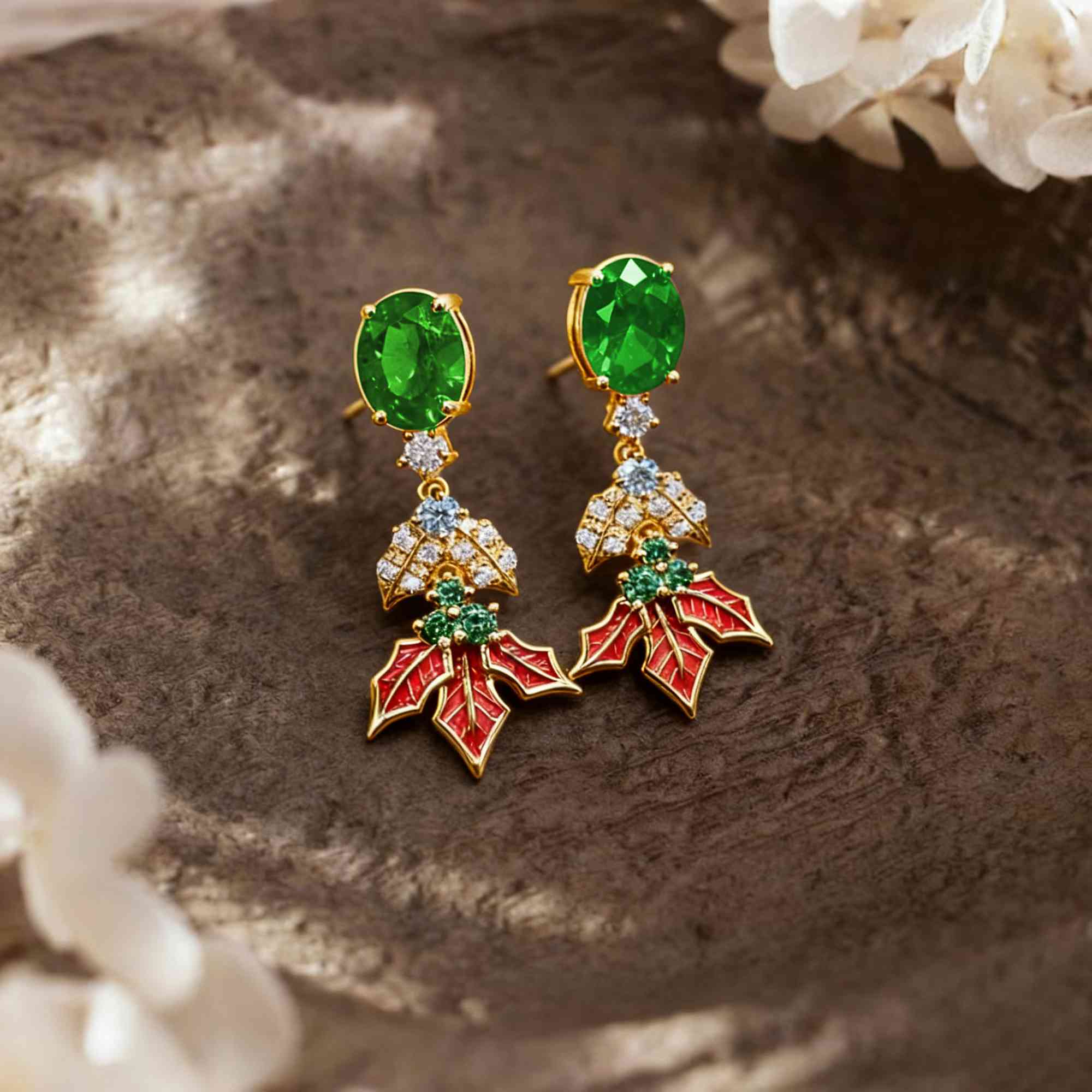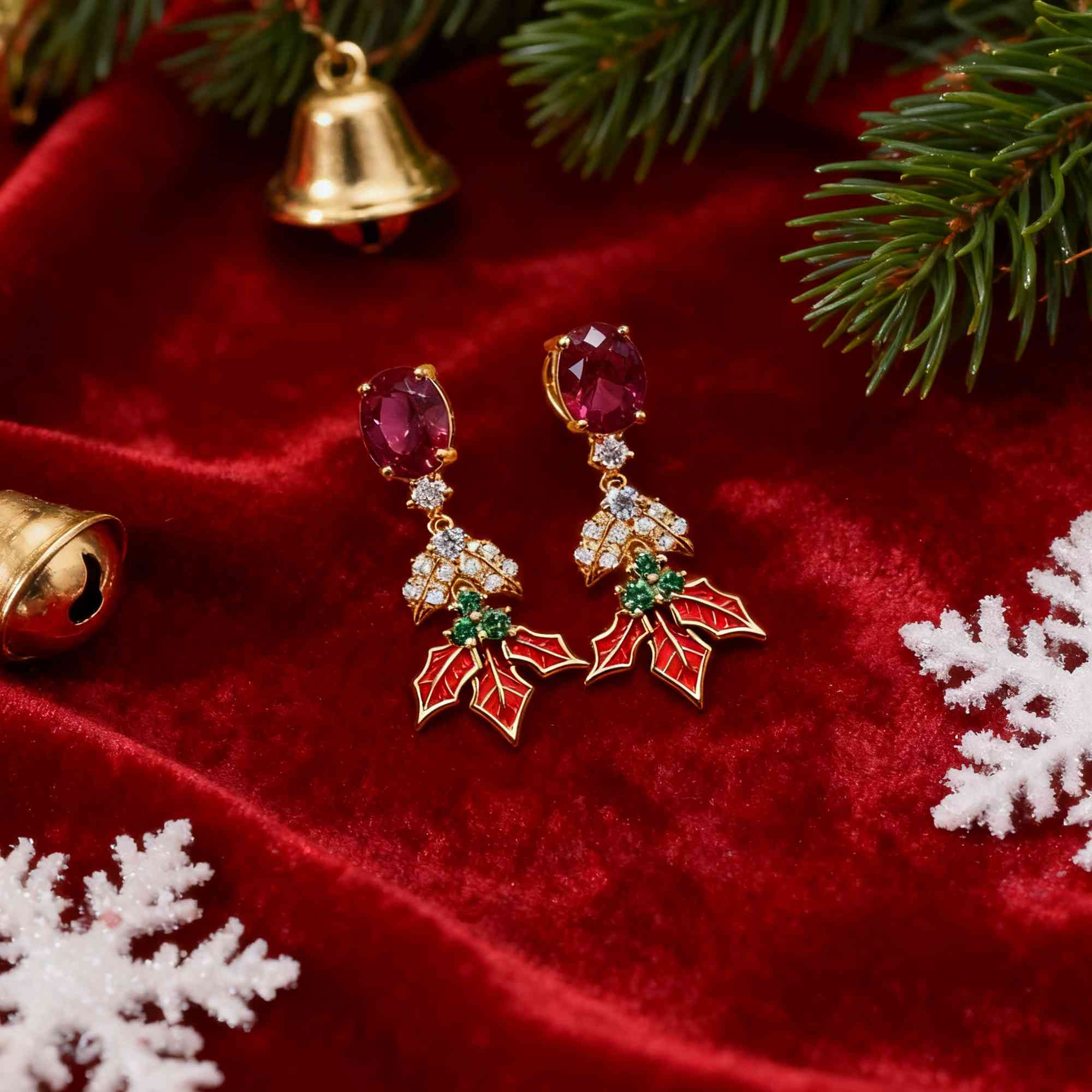 Festive Holly Leaf Design - These handcrafted drop earrings feature a classic Christmas holly leaf motif, adorned with vivid red enamel, sparkling clear stones, and a rich red focal gem (your custom birthstone). Set in polished 925 sterling silver, the design blends holiday charm with elegant shimmer—perfect for adding a festive touch to Christmas dinners, parties, or winter outfits.