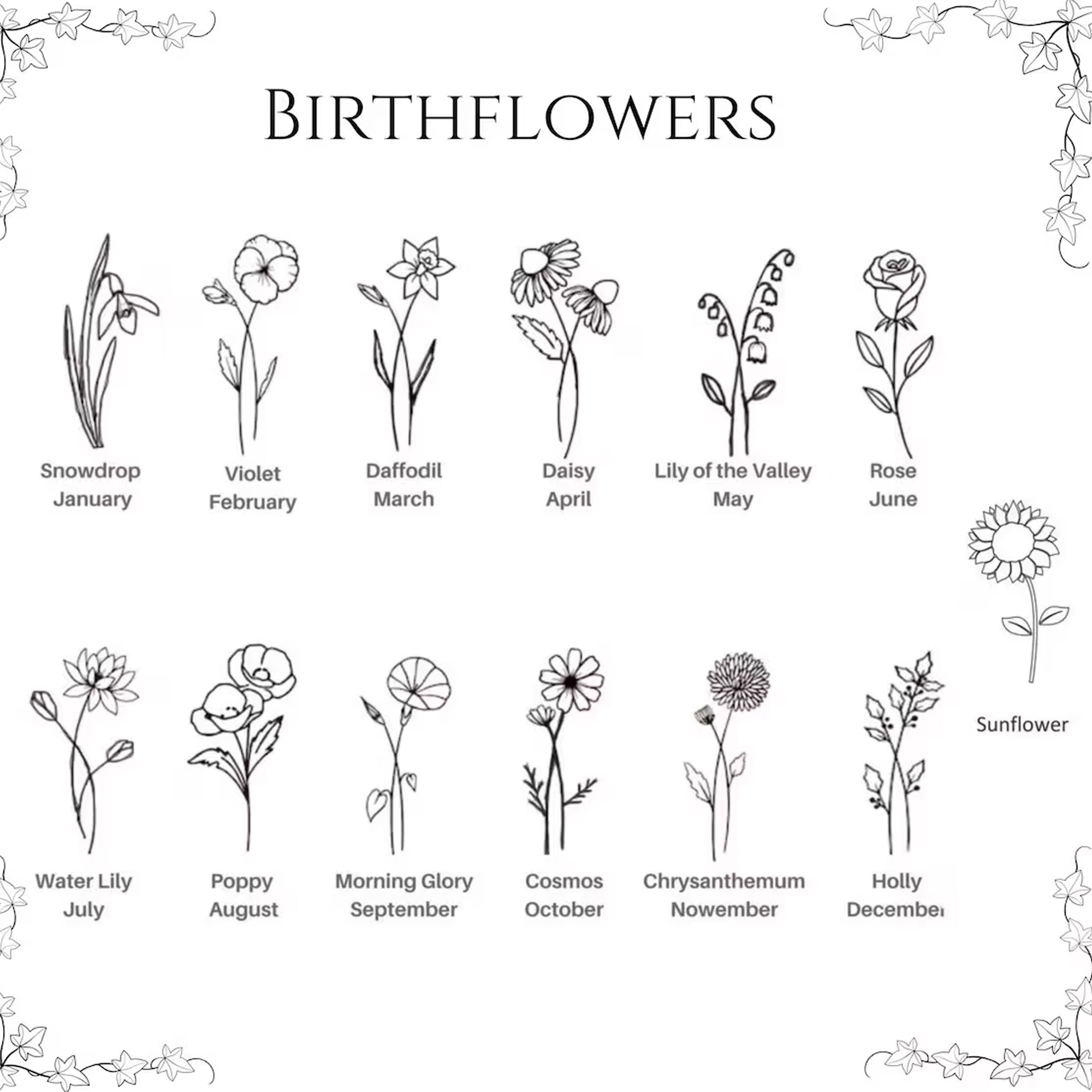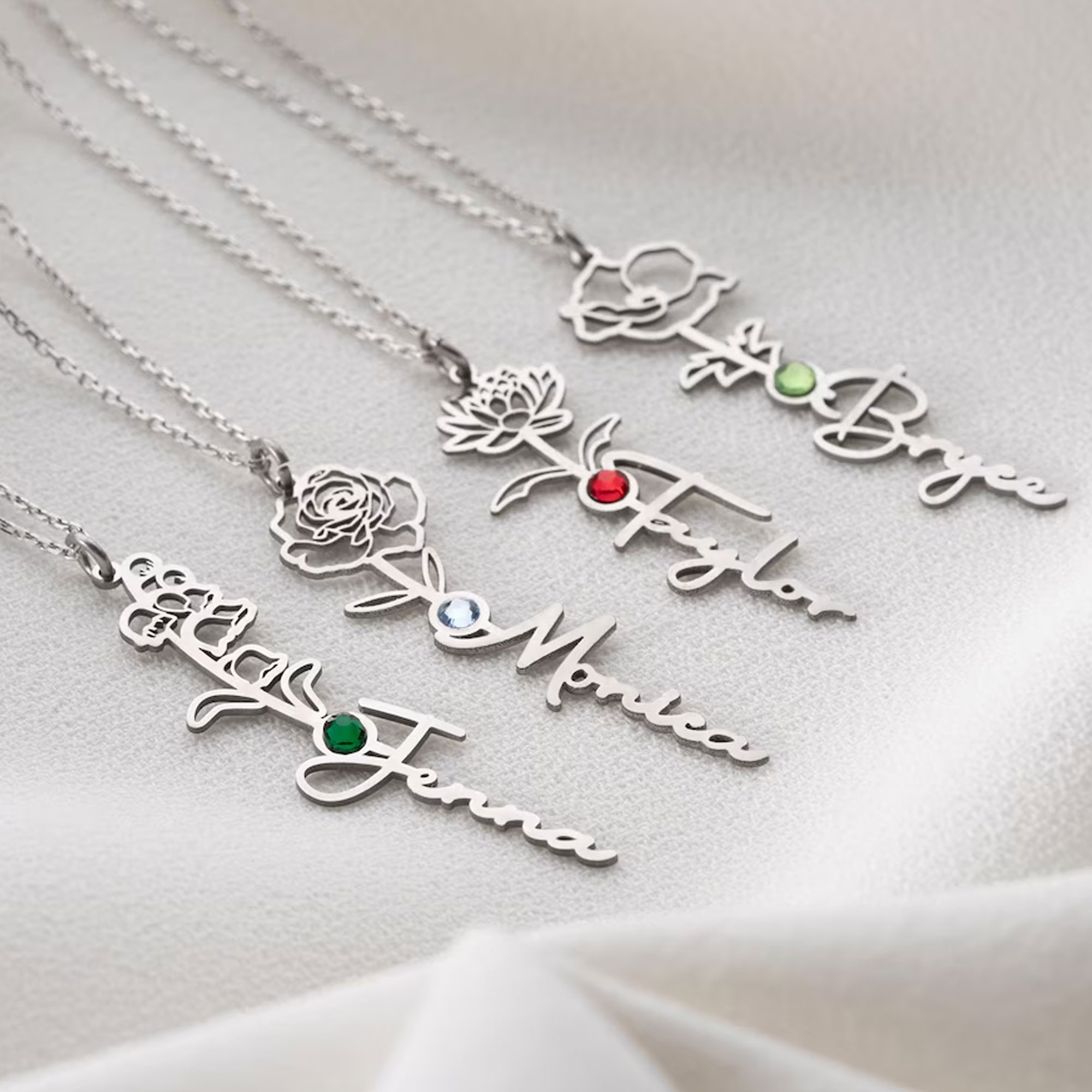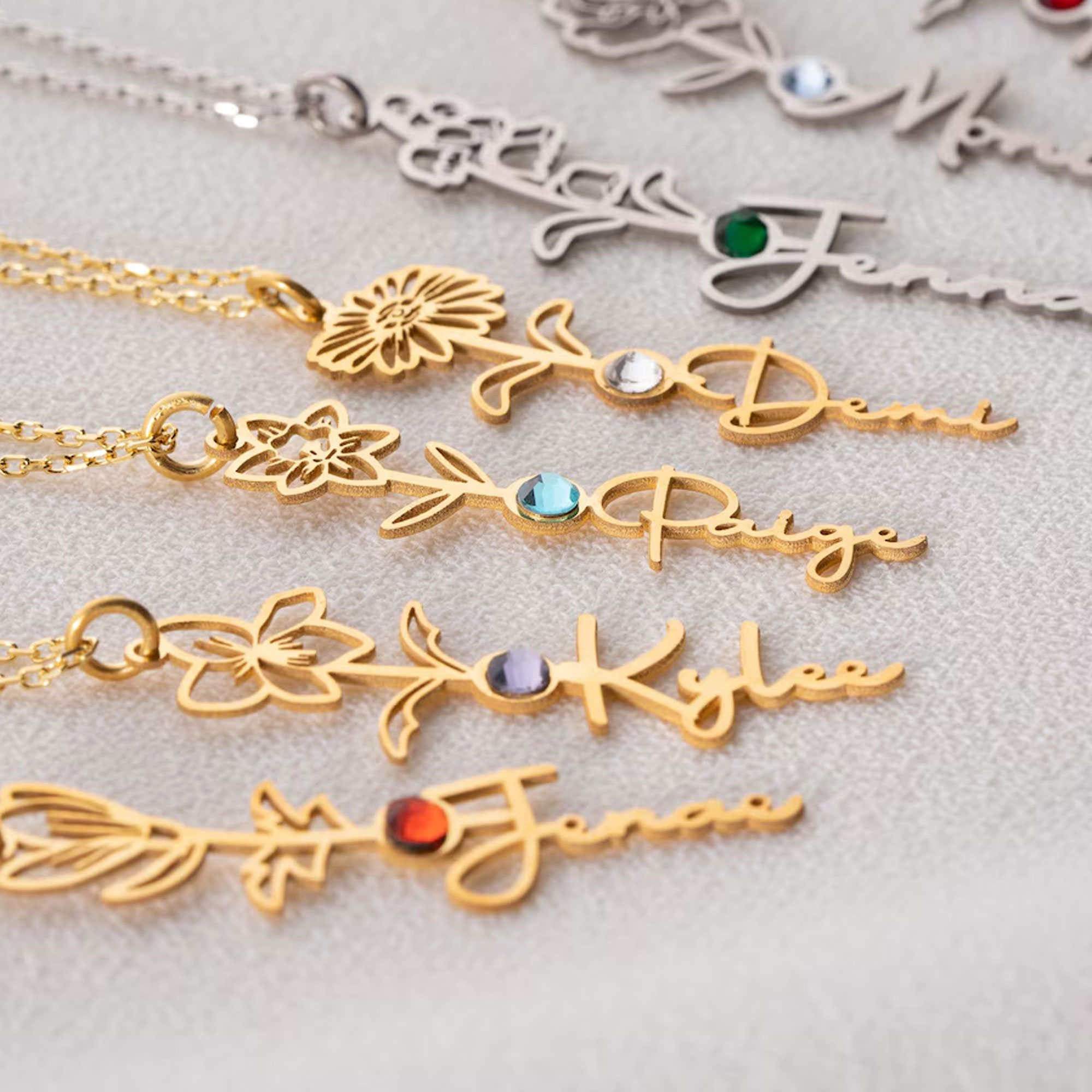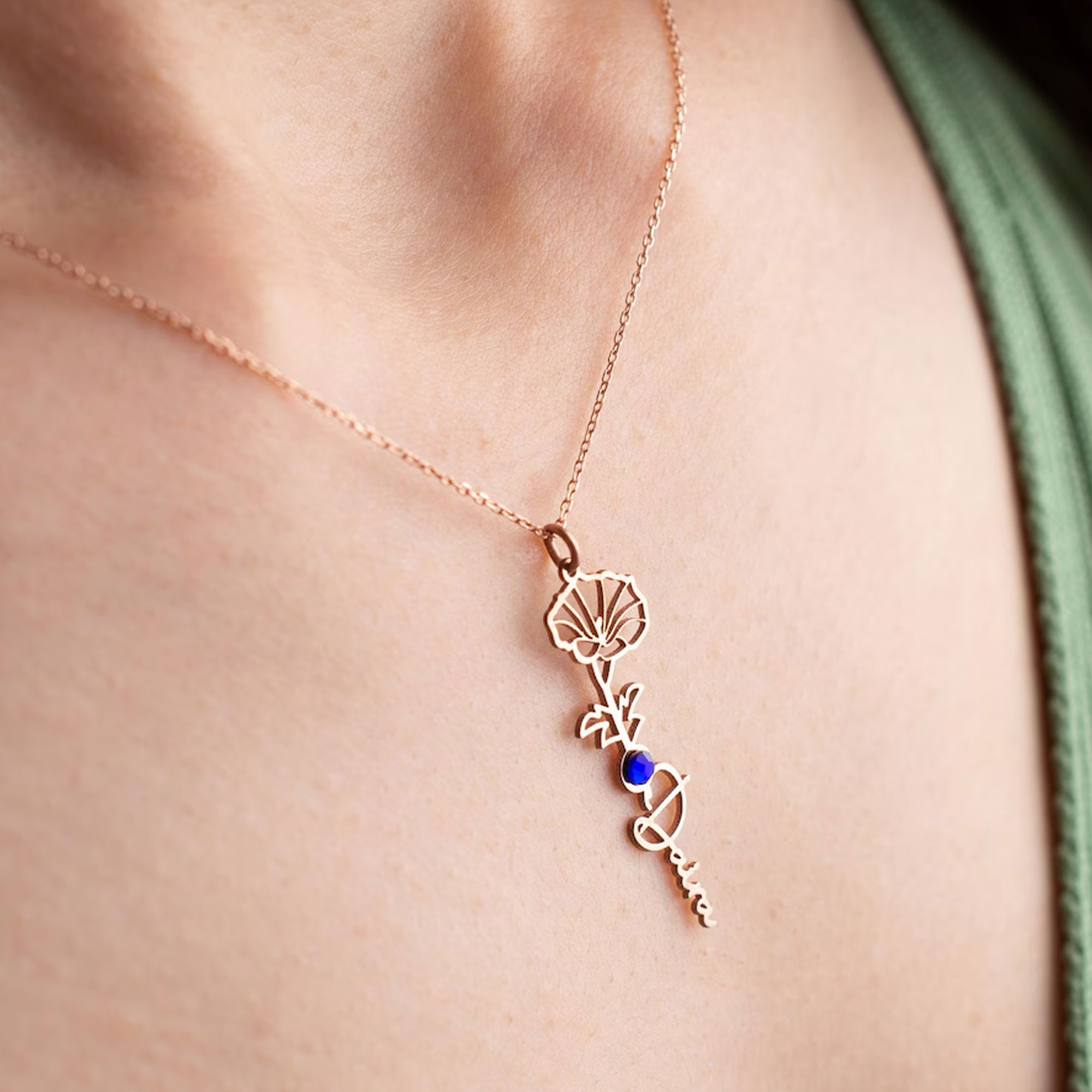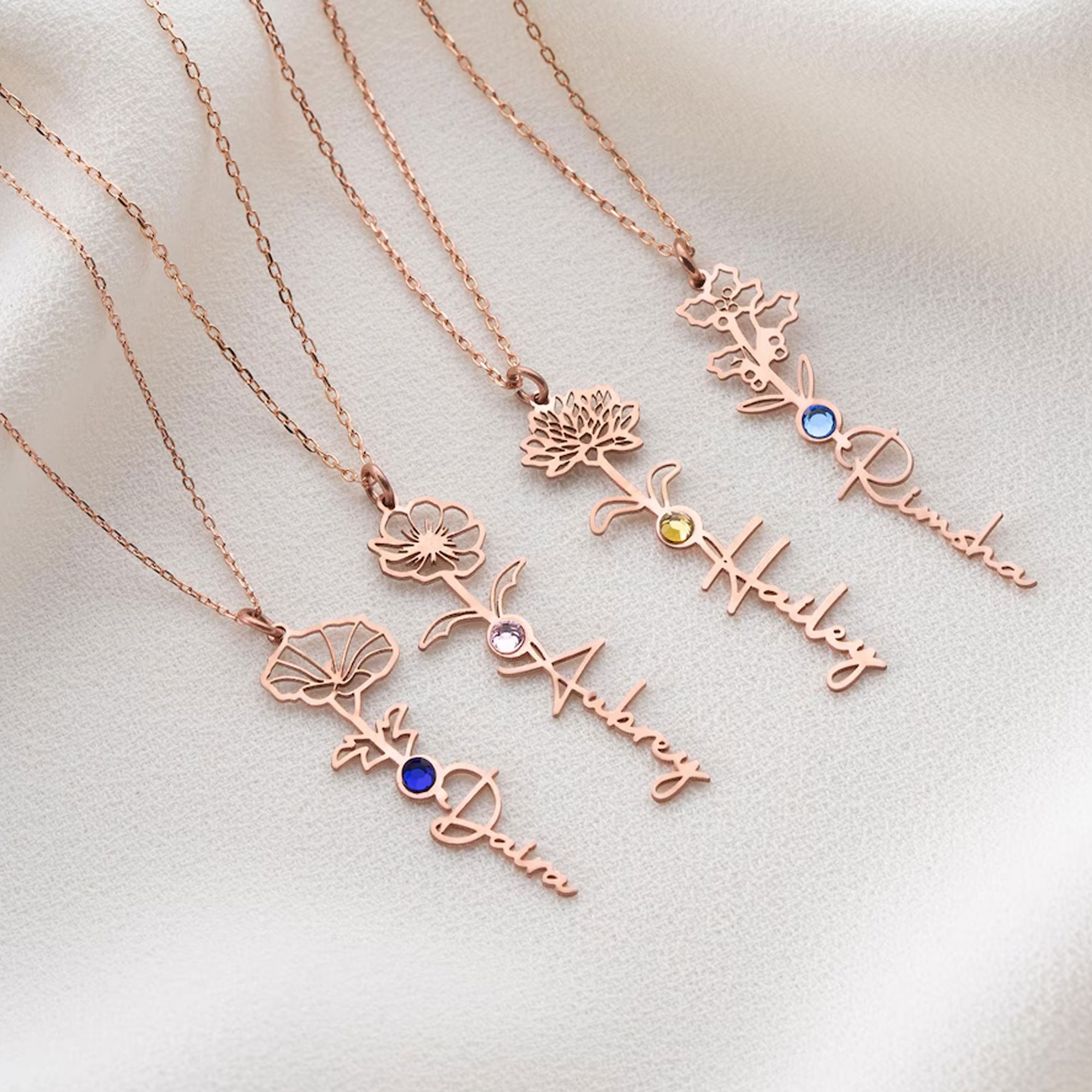 Custom Name with Birth Flower – A custom name is crafted in flowing cursive script, connected to a delicate flower outline that blooms from the lettering. This artistic fusion turns her name into a wearable piece of poetry.