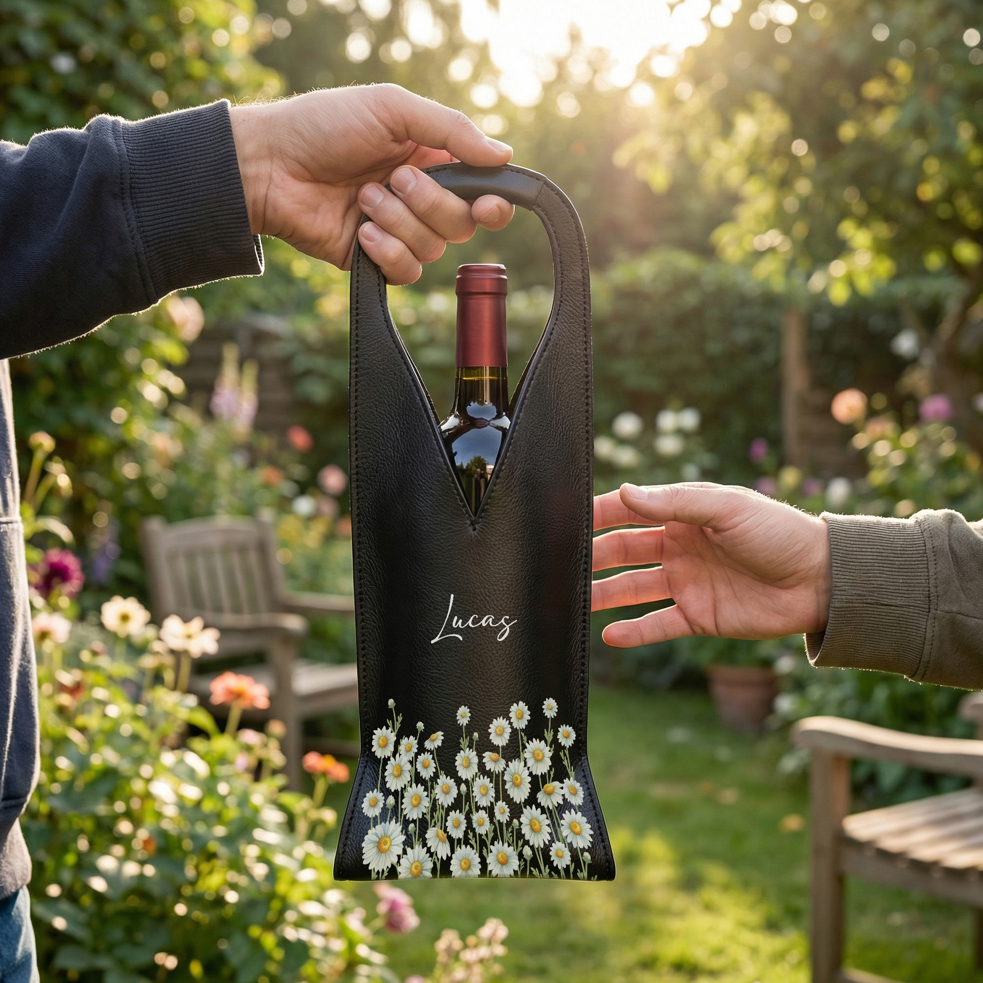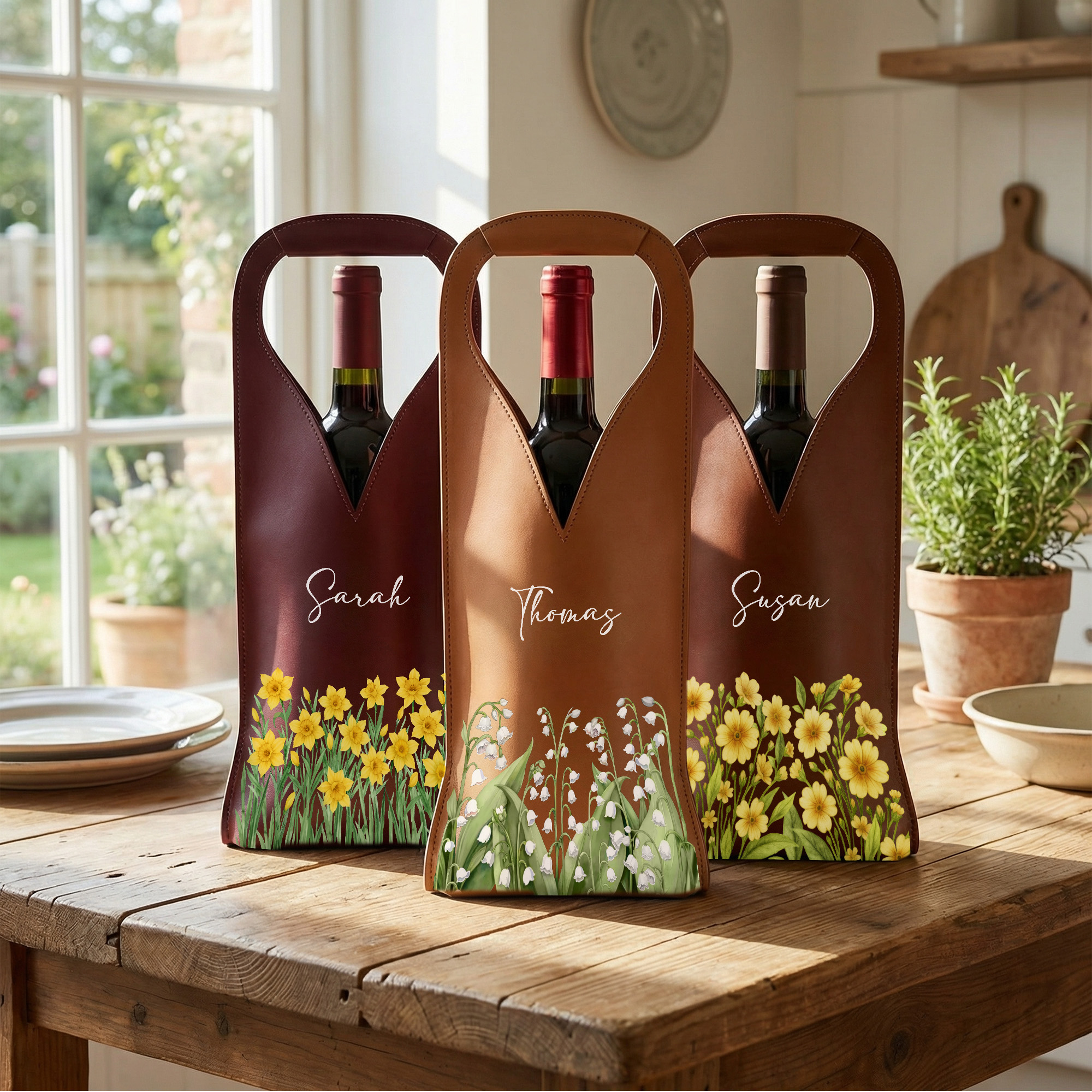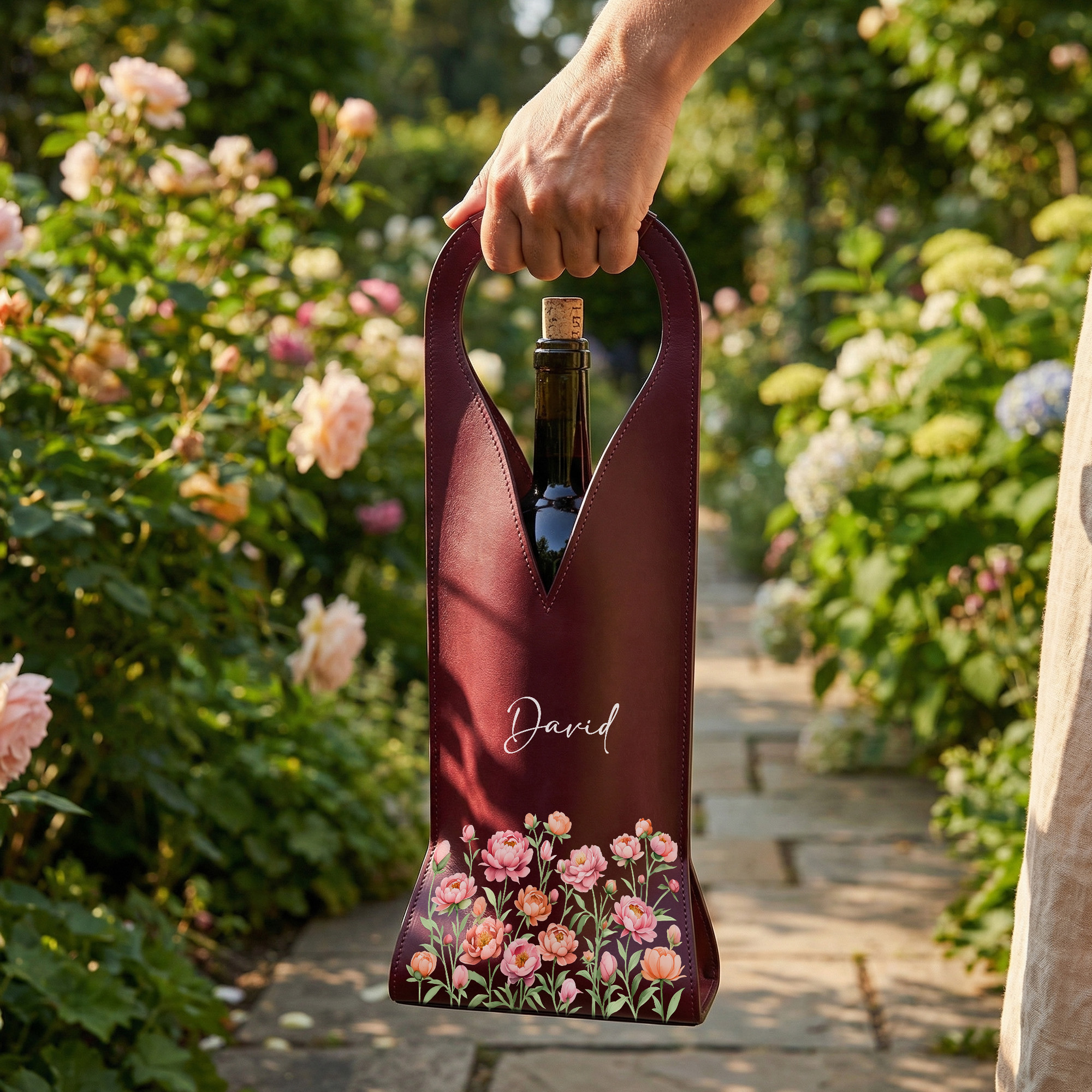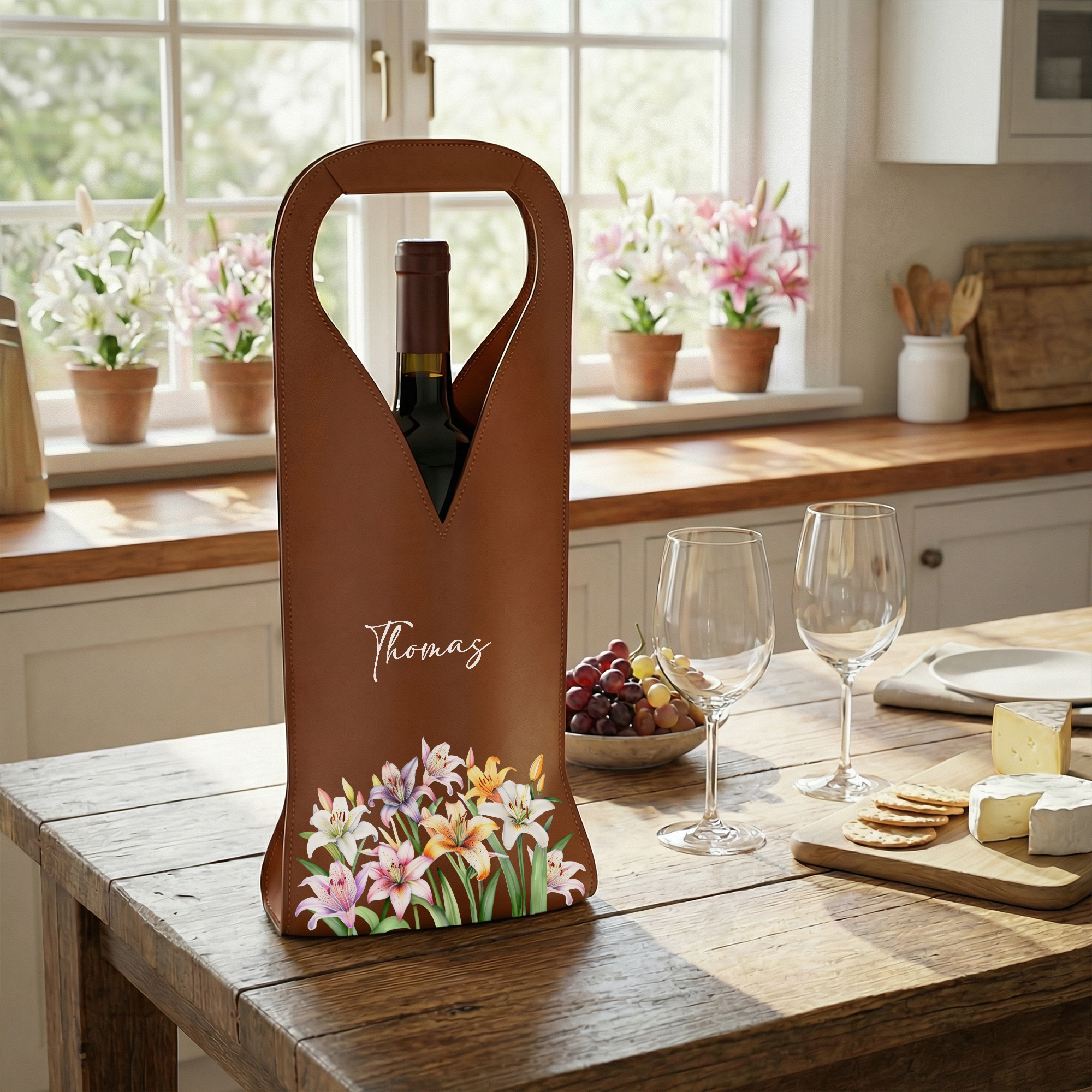 Personalized Birth Flower Design - This wine tote features a beautiful watercolor birth flower design paired with a personalized name, creating a stylish and meaningful gift for any wine lover. The soft floral artwork adds a delicate touch, while the leather tote shape offers a timeless and elegant look perfect for carrying wine in style.