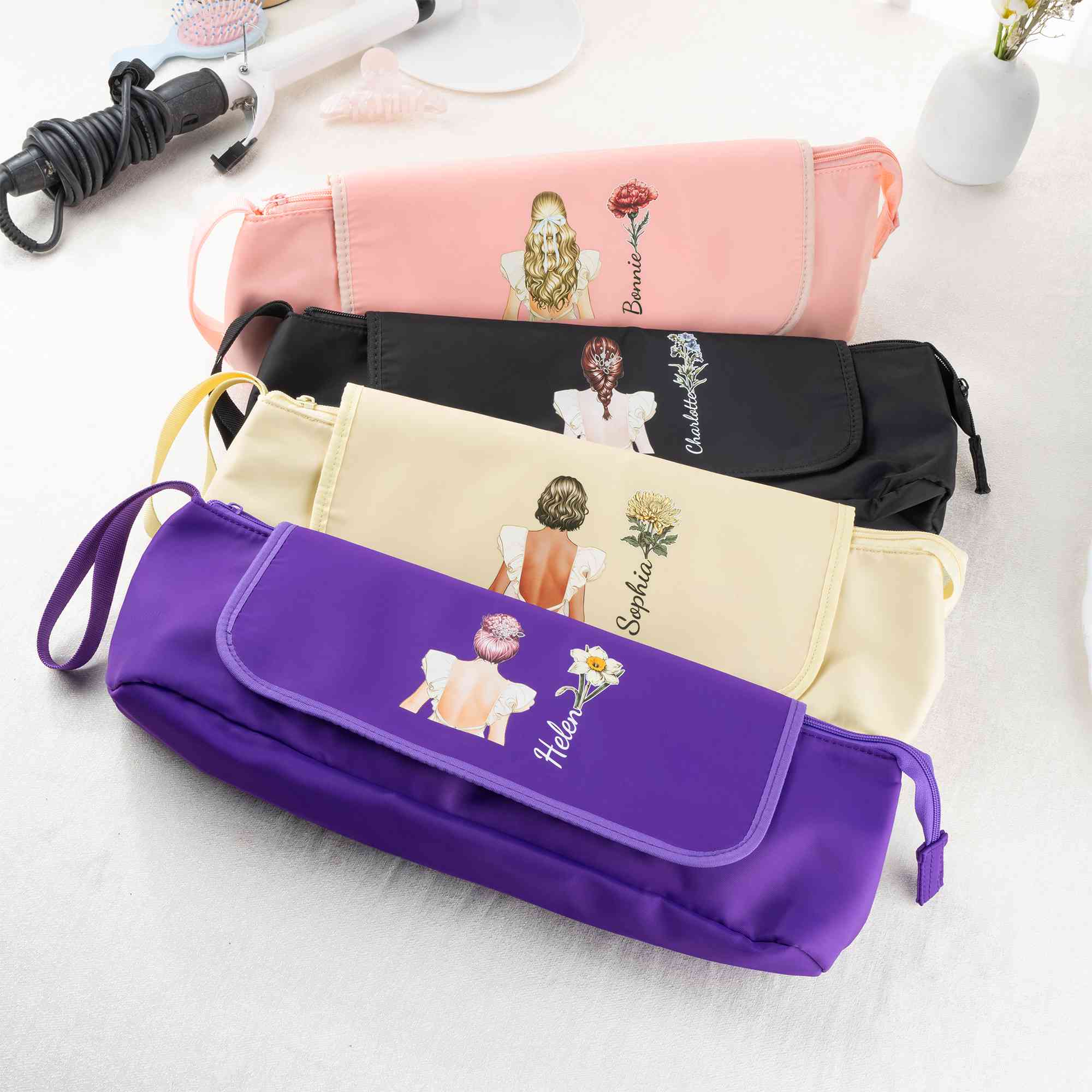 Style Personalized Elegant Girl Back View Multi-compartments Hair Styling Tool Pouch with Name & Birth Flower