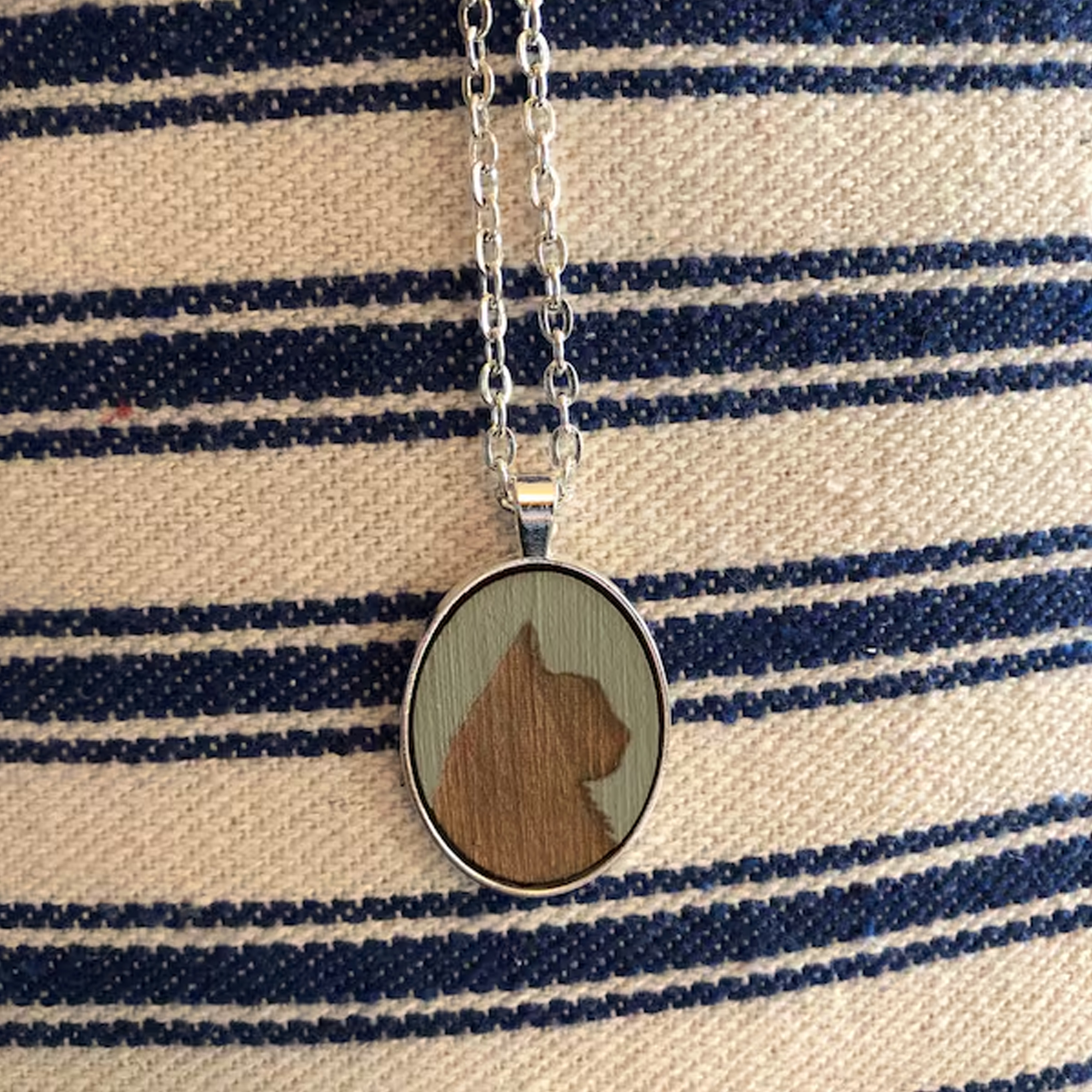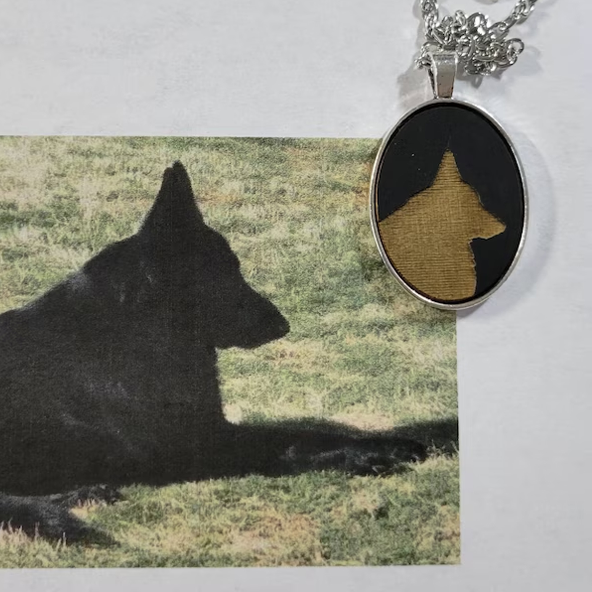 Wooden Pet Silhouette – A handcrafted oval pendant featuring a silhouette of a beloved pet, set against a soft-colored background. The natural wood texture adds warmth and character to every piece.