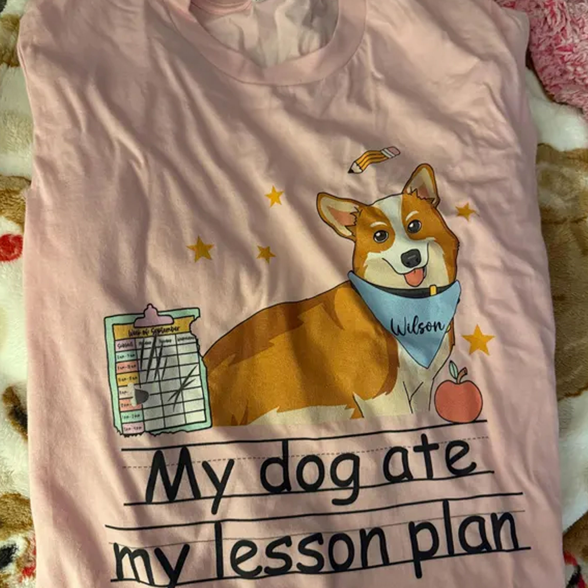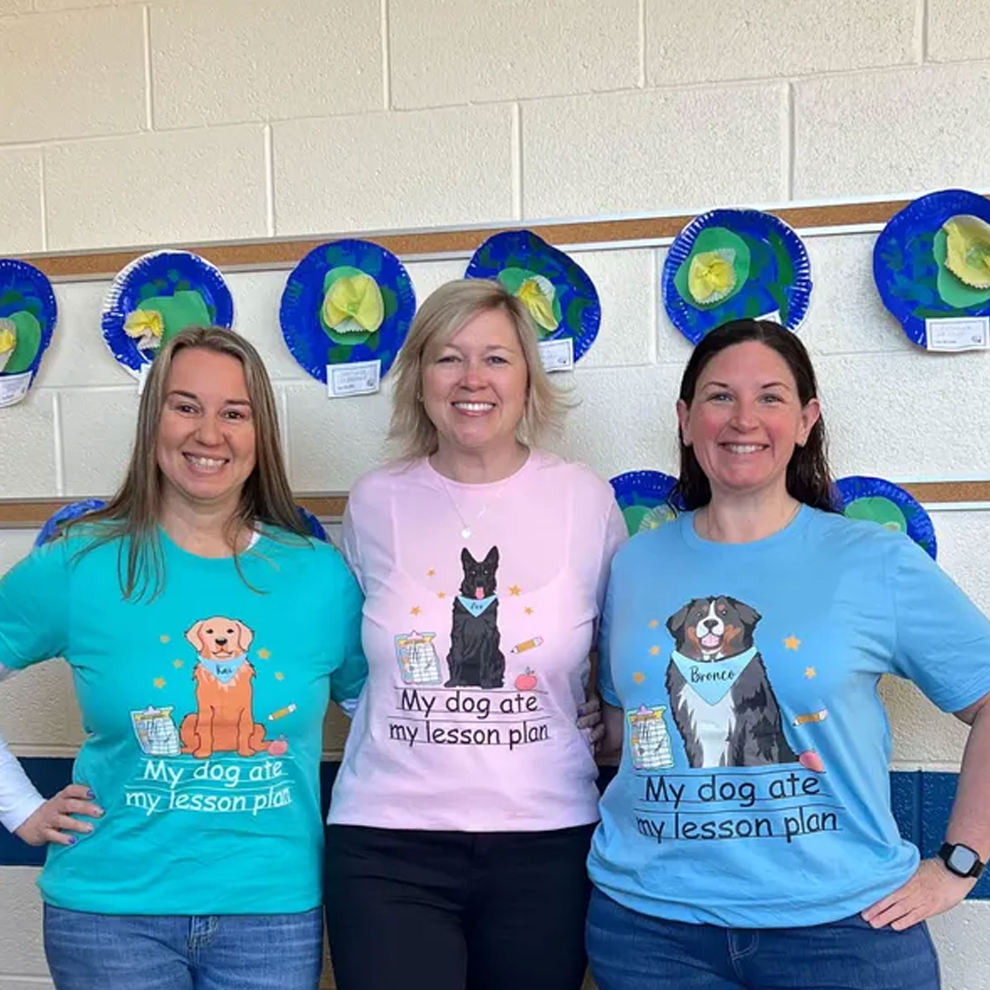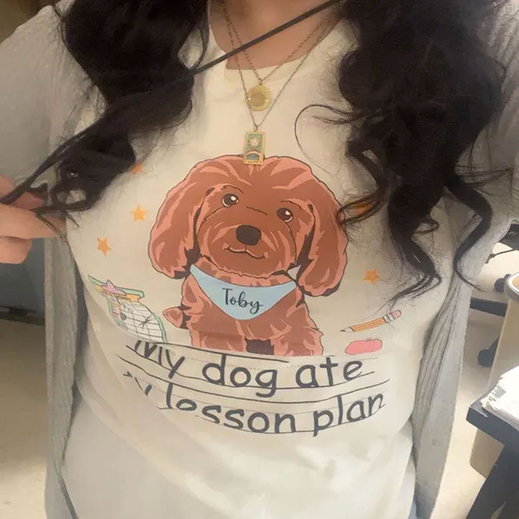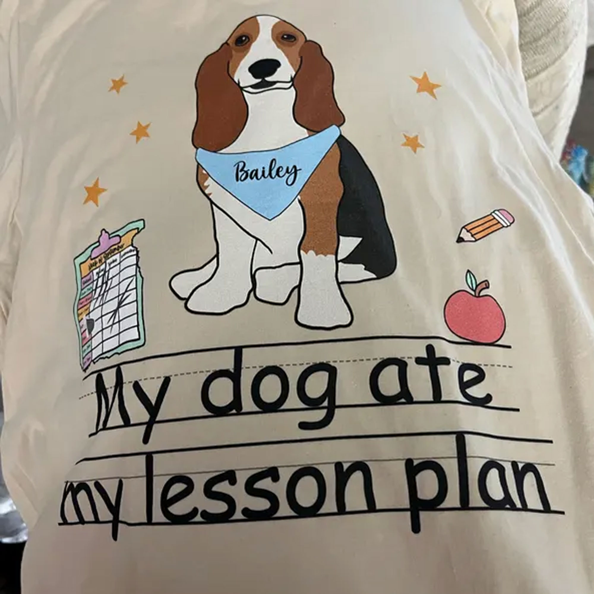 Teacher T-Shirt with Dog – This fun cotton crewneck features a cute dog illustration wearing a bandana with your pet’s name—and the playful phrase “My dog ate my lesson plan.” Available in multiple colors and styles, it’s perfect for teachers who love their furry sidekicks.