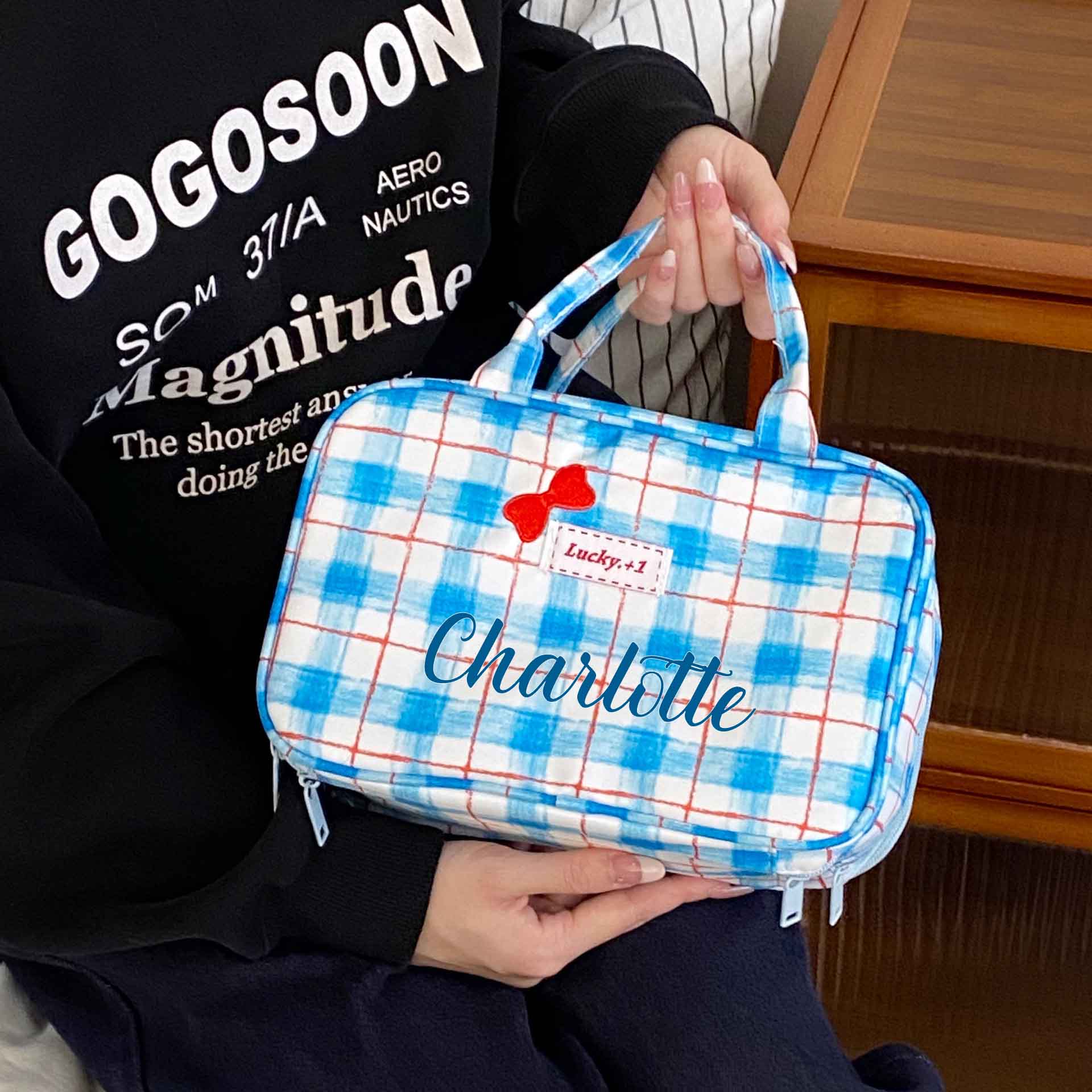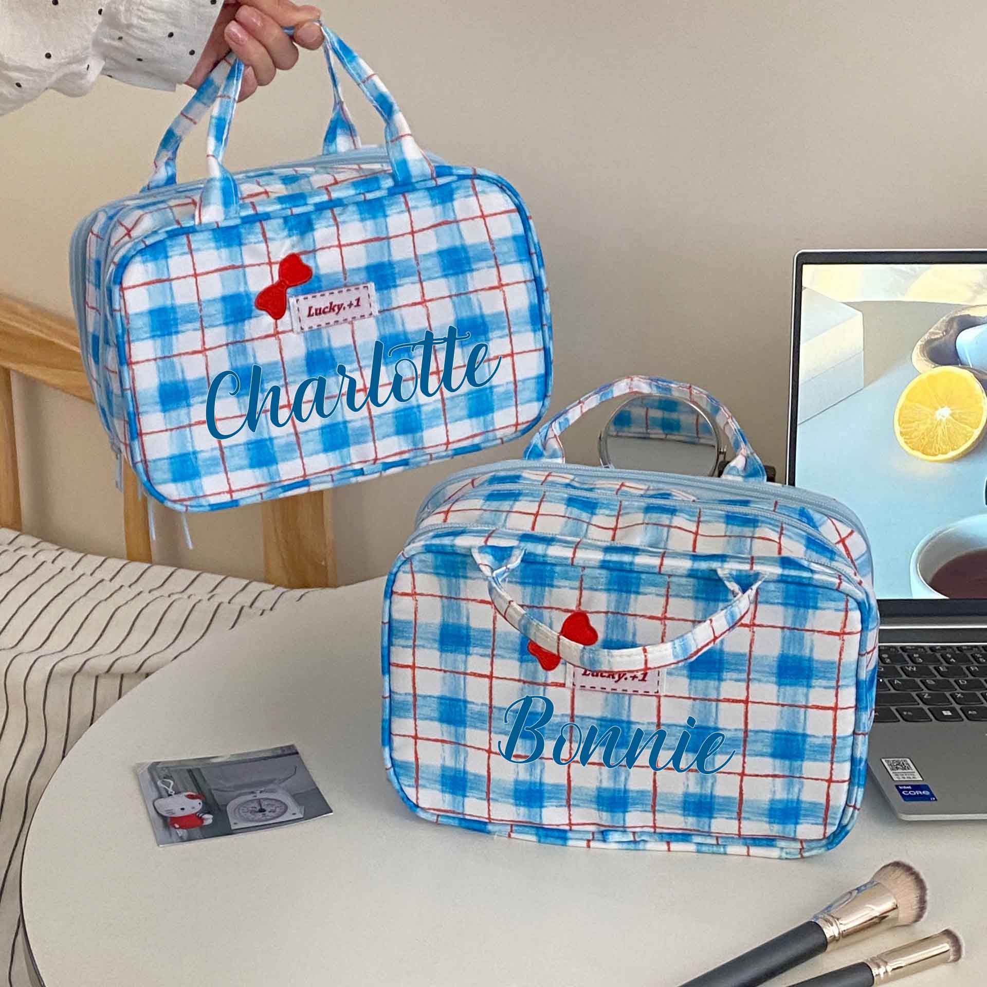 | Style | Personalized Name Blue Plaid Handbag with Bow |