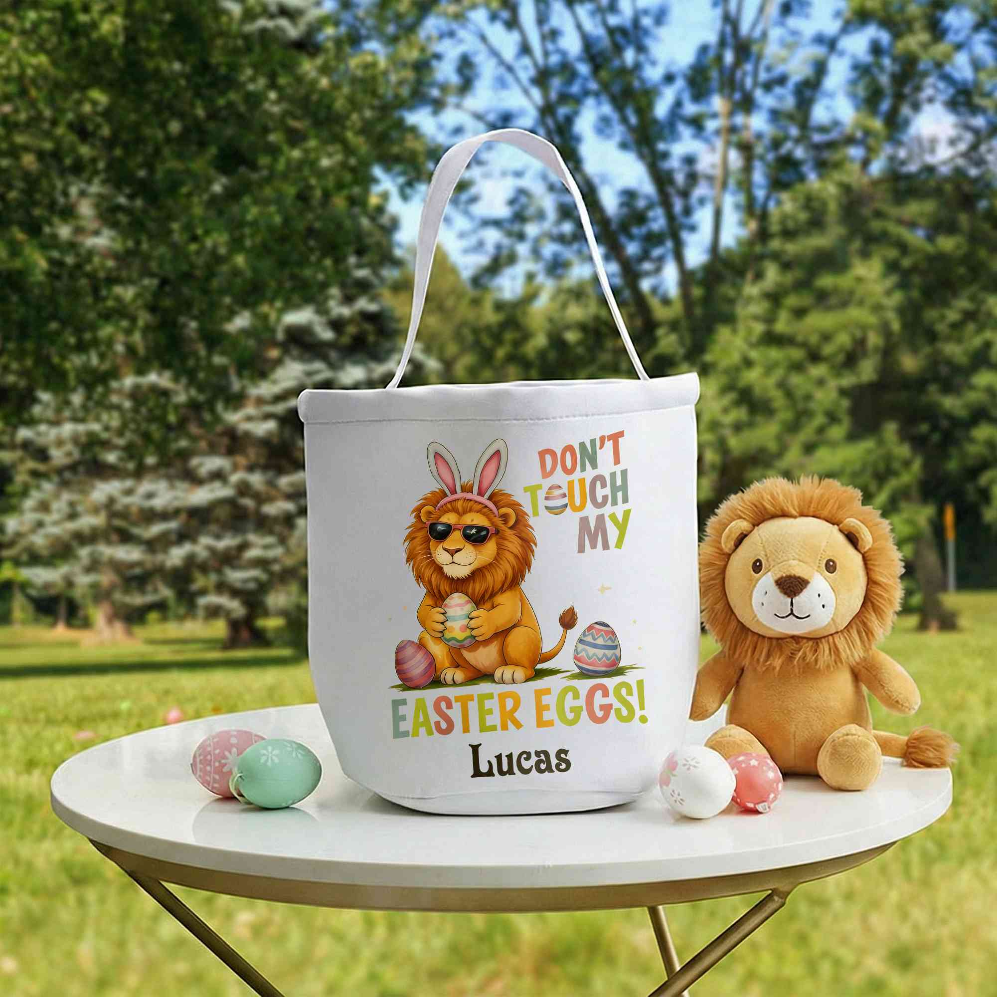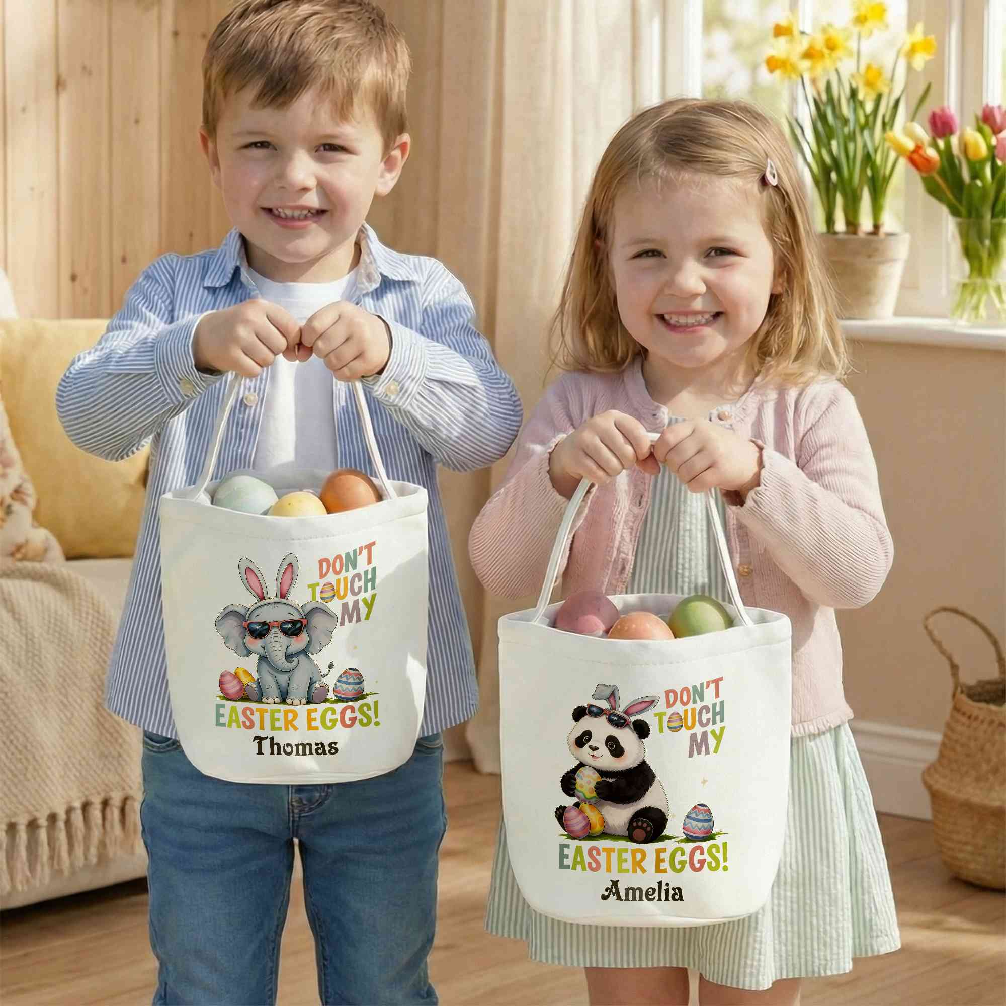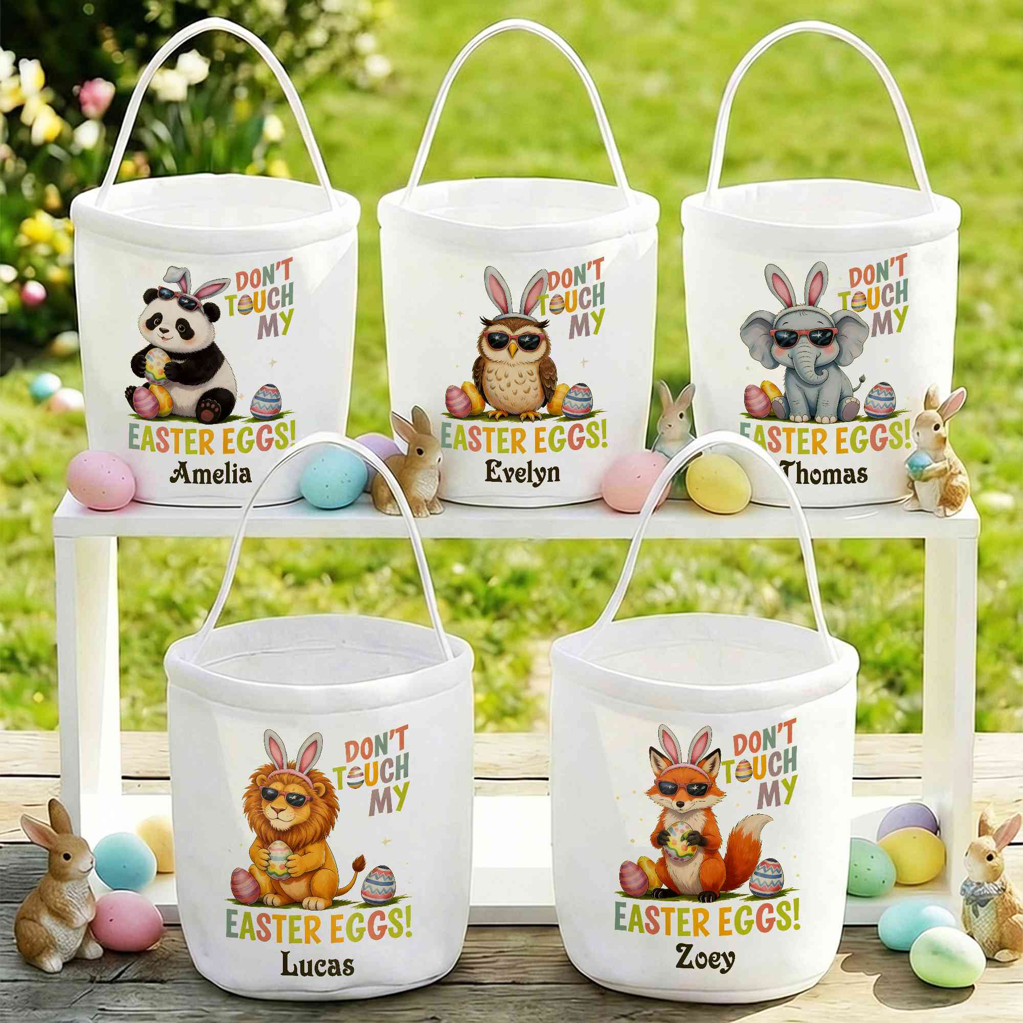 Personalized Name Don't Touch My Easter Eggs Bunny Ears Animal Design Easter Basket, Large Capacity Canvas Goodie Bag, Easter Gift for Kids/Boys/Girls
