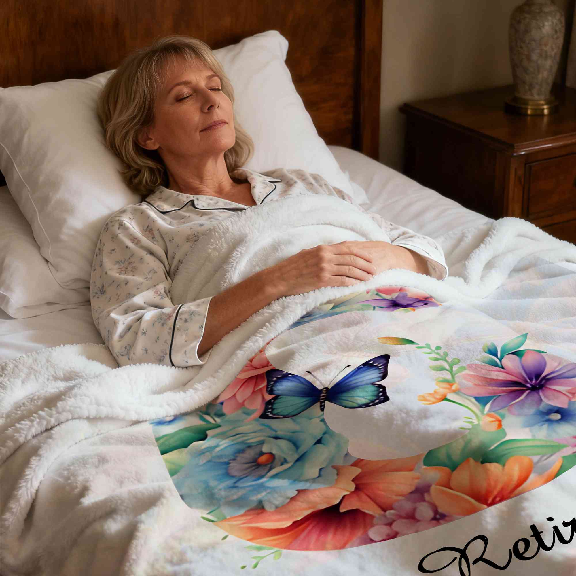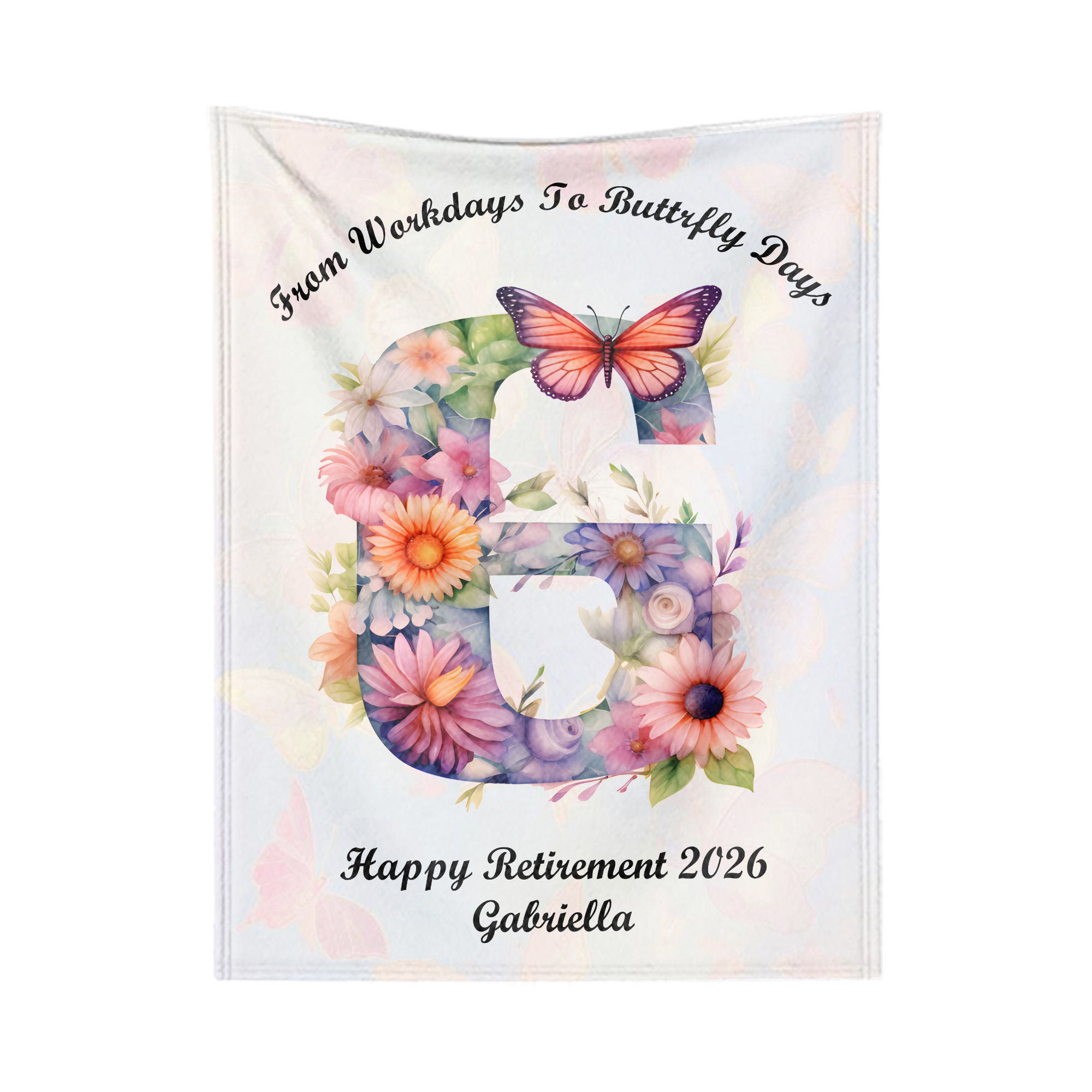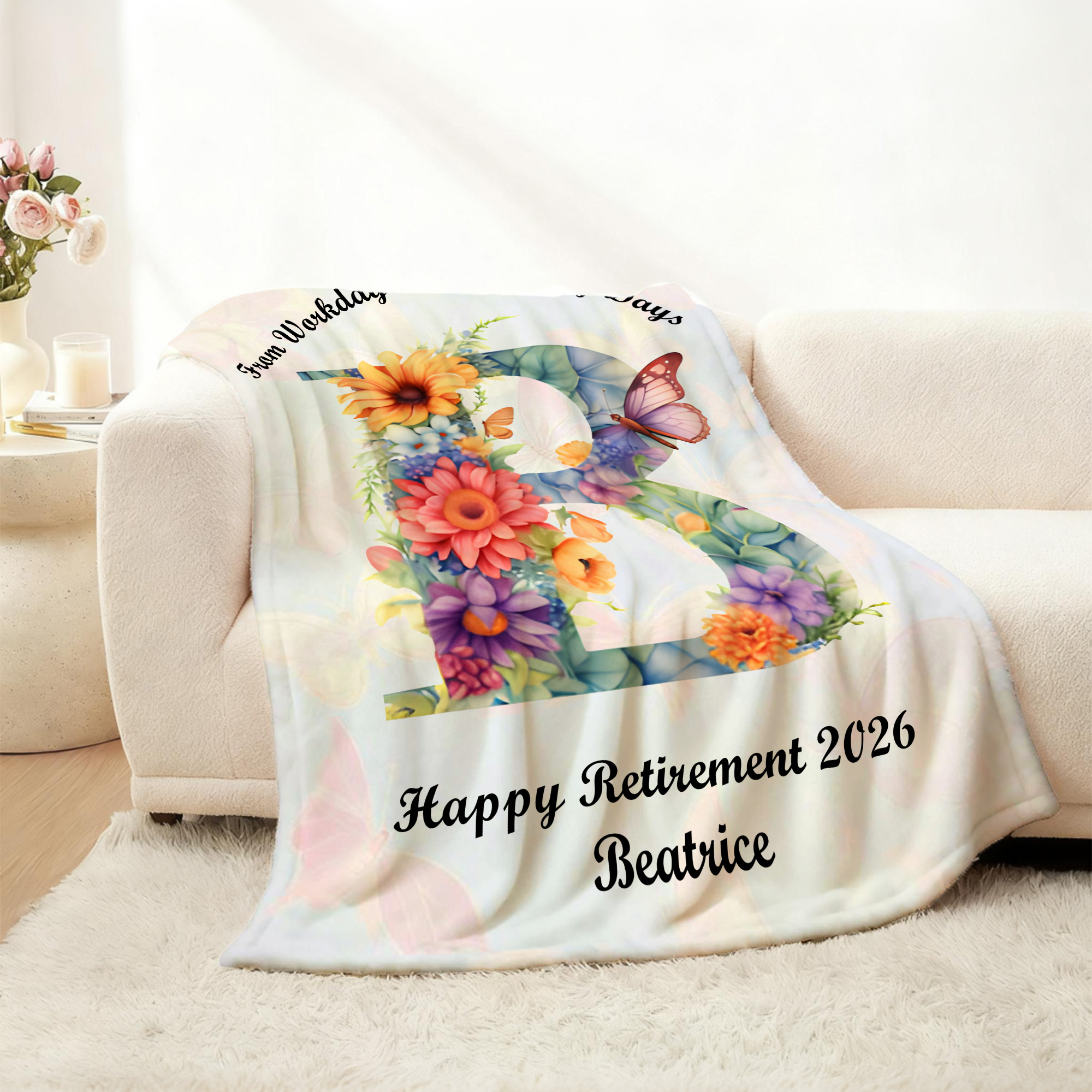 Elegant Floral Alphabet Design - This personalized "Happy Retirement" blanket features a graceful floral alphabet paired with a soft butterfly accent, bringing a warm and uplifting touch to any home decor. The design celebrates a new chapter in life with charm and gentle color details that feel meaningful and joyful.