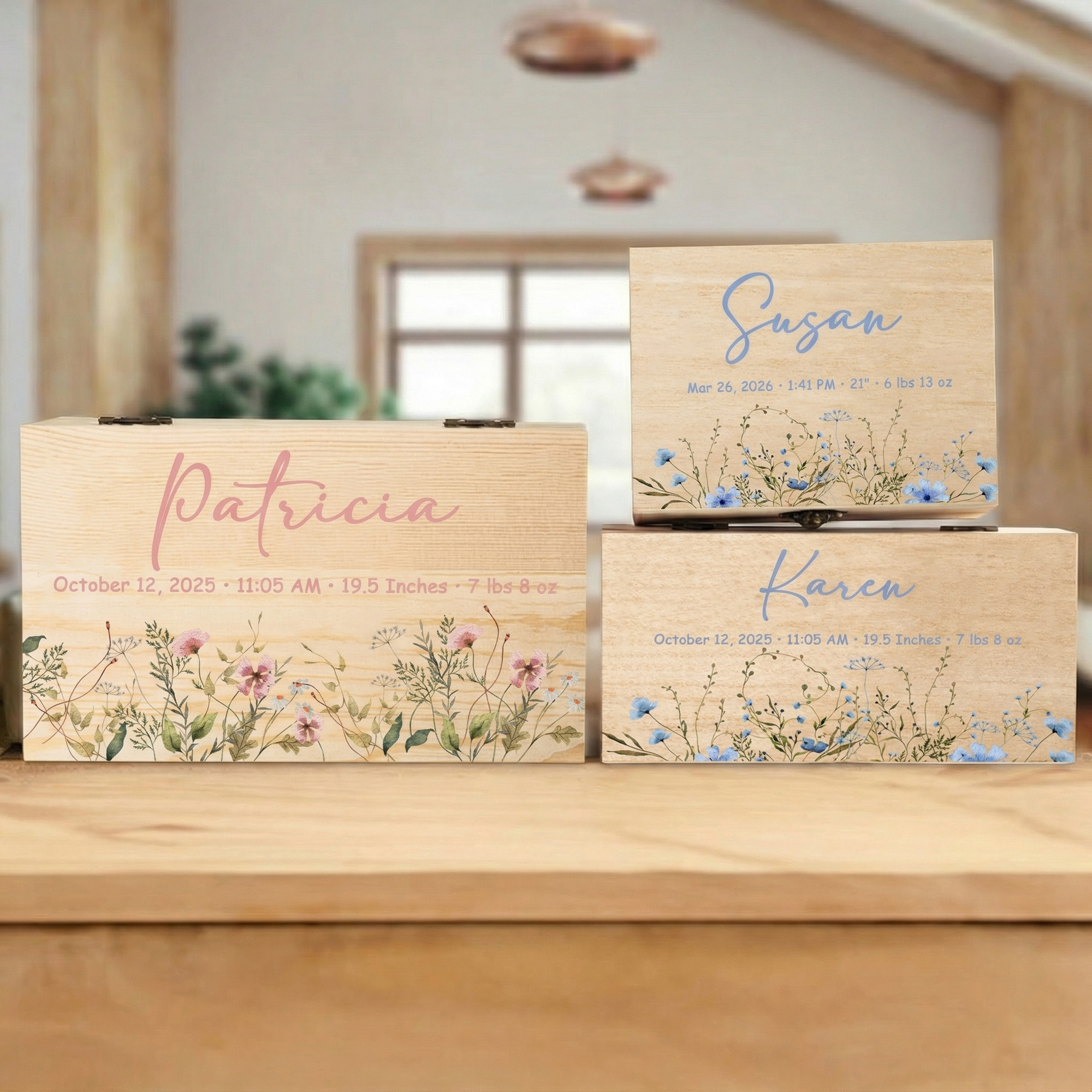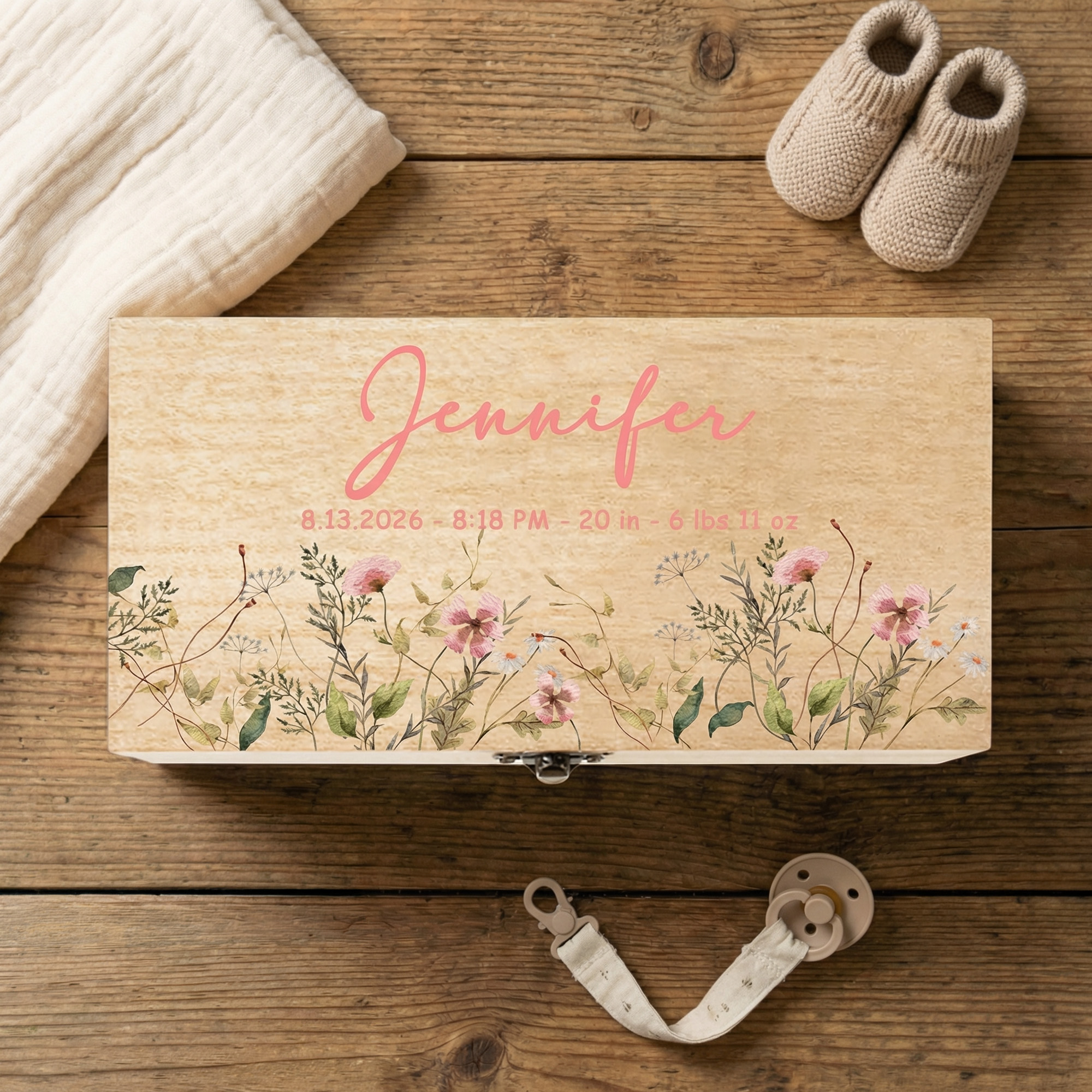 | Style | Personalized Name Wildflower Baby Birth Keepsake Box with Text |