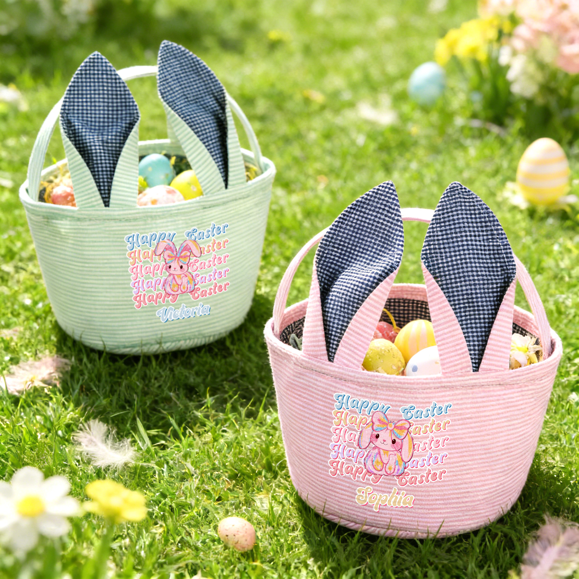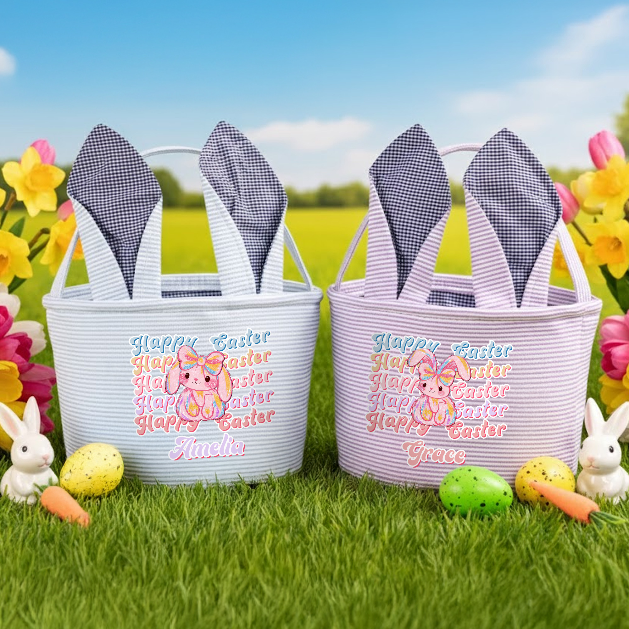Personalized Name Y2K Bunny Easter Basket with Rabbit Ears, Seersucker Large Capacity Easter Egg Hunt Bucket Bag, Easter Gift for Kids/Boys/Girls